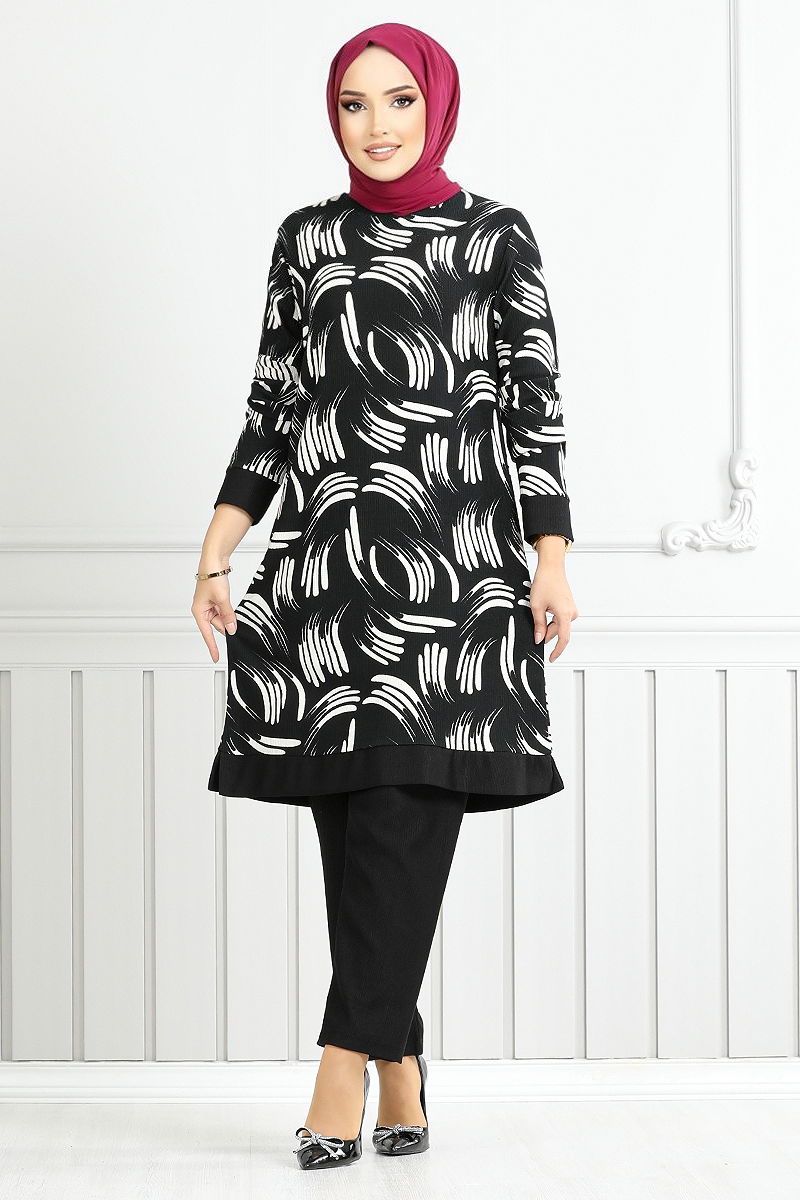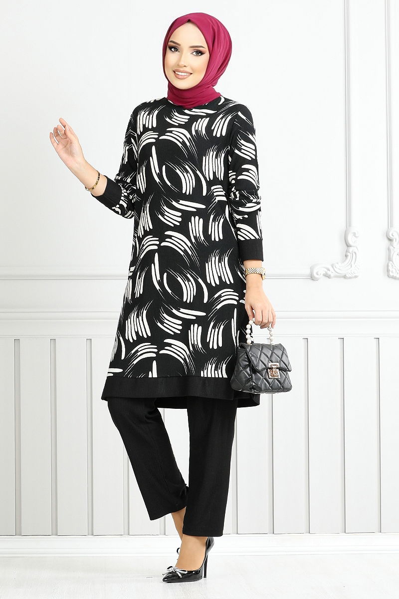 Side Slit Patterned Suit model hijab product. Suitable for Autumn and Winter season. Washable at 30 DEGREES WITHOUT SQUEEZING. (DELICATE WASH) It is made of karen fabric. The product has a bicycle collar. The tunic has a side slit and is lining-free. (The product on the model is size 38.) The waist of the pants is elasticized.