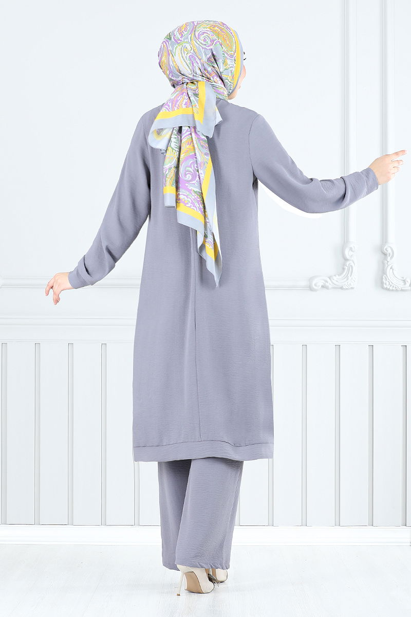 Yandan Yırtmaçlı İkili Takım, özel tasarlanmış tesettür modeli ile dört mevsim rahatlıkla kullanılabilir. Hassas doku sayesinde 30 derecede sıkılmadan yıkanabilir ve aerobin kumaş konforunu sunar. Bisiklet yaka, astarsız tunik ve esnek beli pantolon ile mükemmel uyumu yakalayın. Model üzerindeki ürün 40 bedendir.