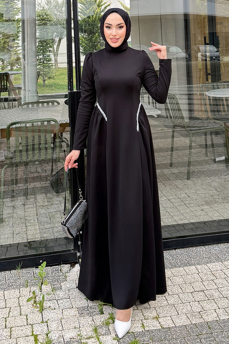 Yanları Taşlı Örme Krep Elbise Siyah
