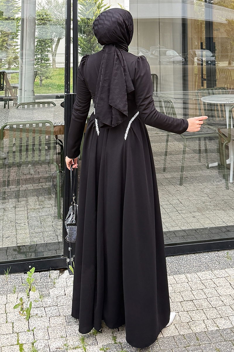 Zarif ve şık tasarımıyla göz kamaştıran Yanları Taşlı Örme Krep Elbise, dört mevsim rahatlıkla kullanılabilen bir tesettür modelidir. Yarım Hakim yaka ve sırttan fermuar detayıyla modern bir dokunuş sunarken, volanlı etek tasarımı ile feminen bir hava katmaktadır. Ürün, pratik kullanım için astarsız olup, taş detayları ise yapıştırmadır. Sadece kuru temizleme ile bakımı önerilmektedir.
