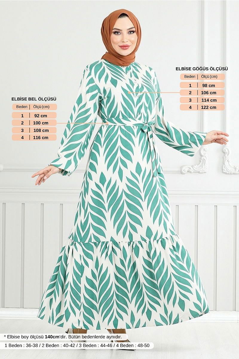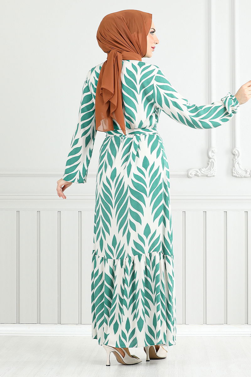 Yaprak Desenli Tesettür Elbise 827OZR1047-M Mint