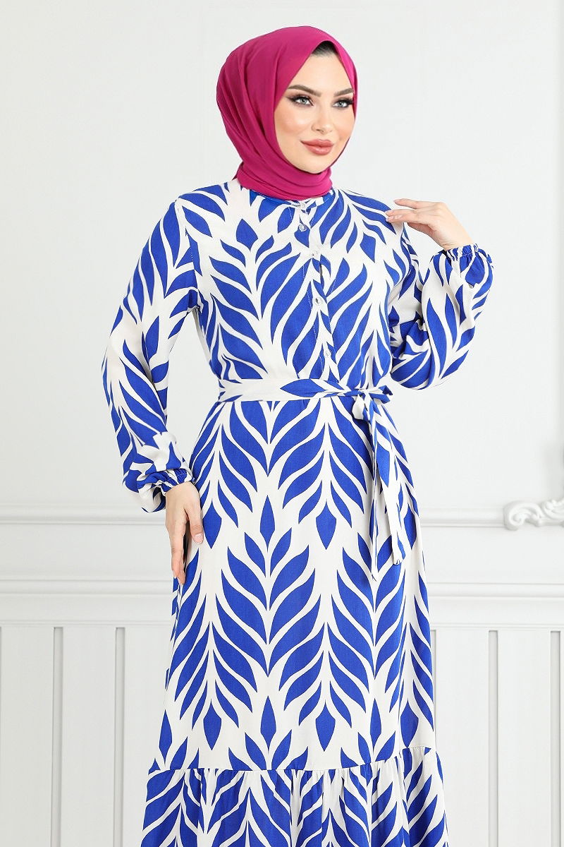 Yaprak Desenli Tesettür Elbise 827OZR1047-M Saks