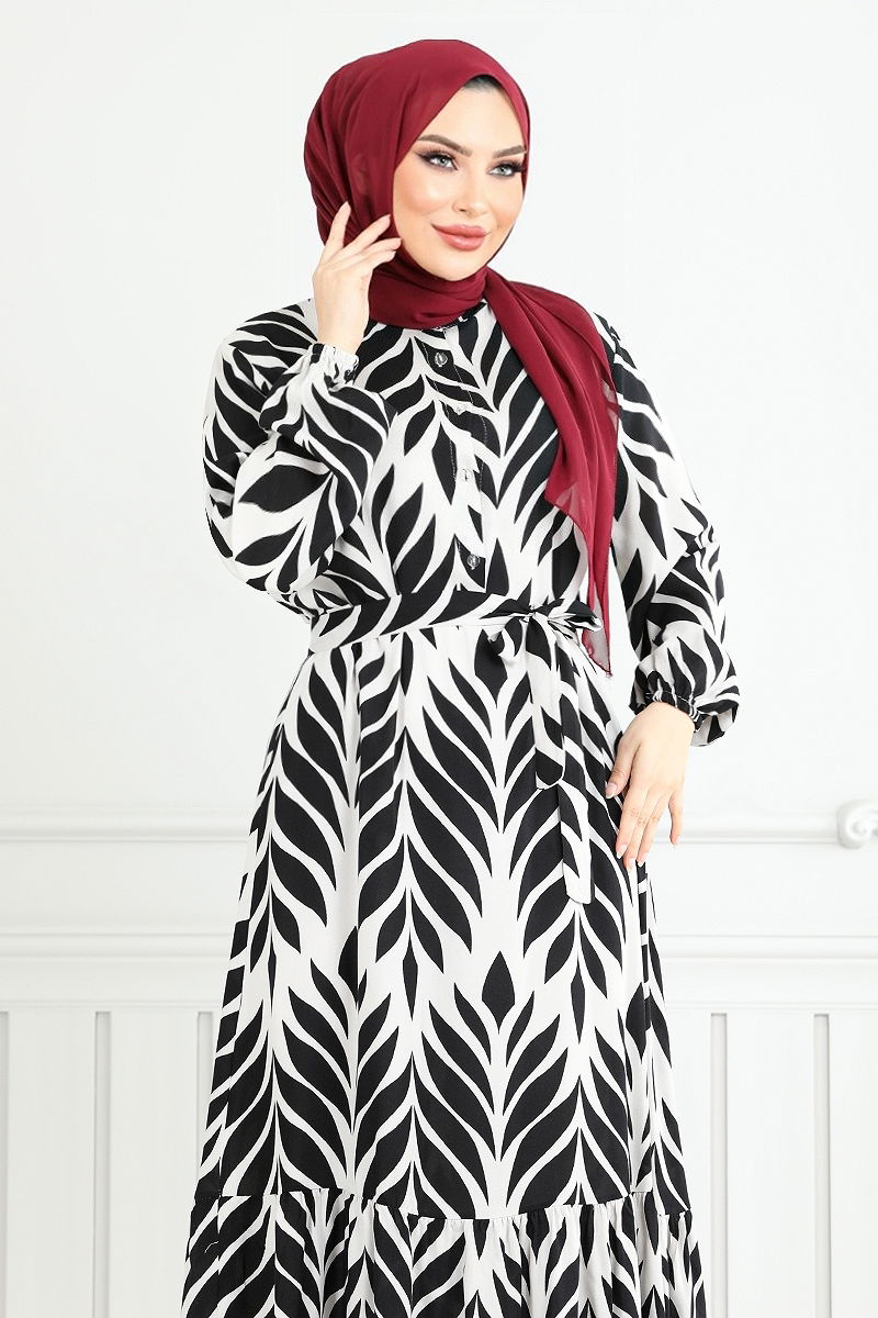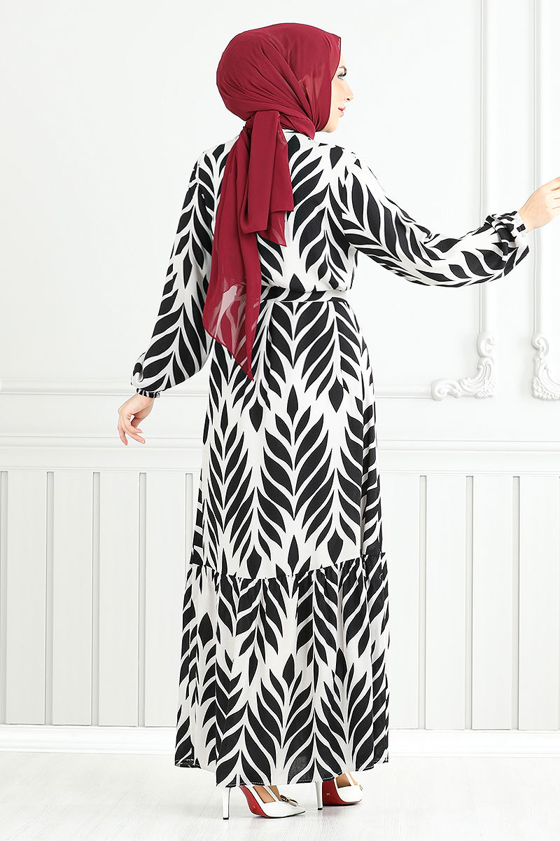 Yaprak Desenli Tesettür Elbise 827OZR1047-M Siyah