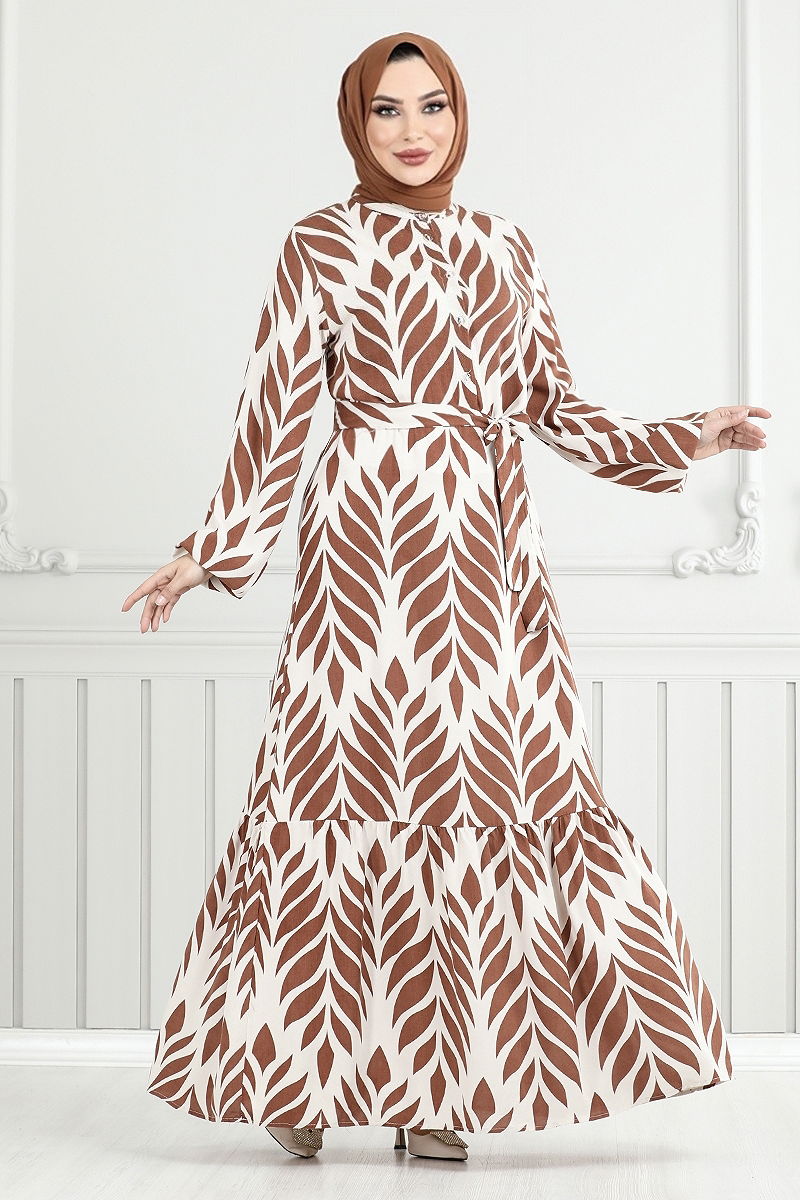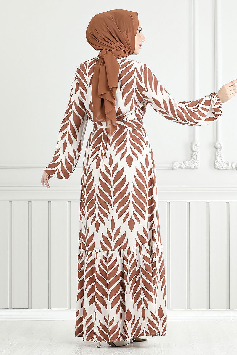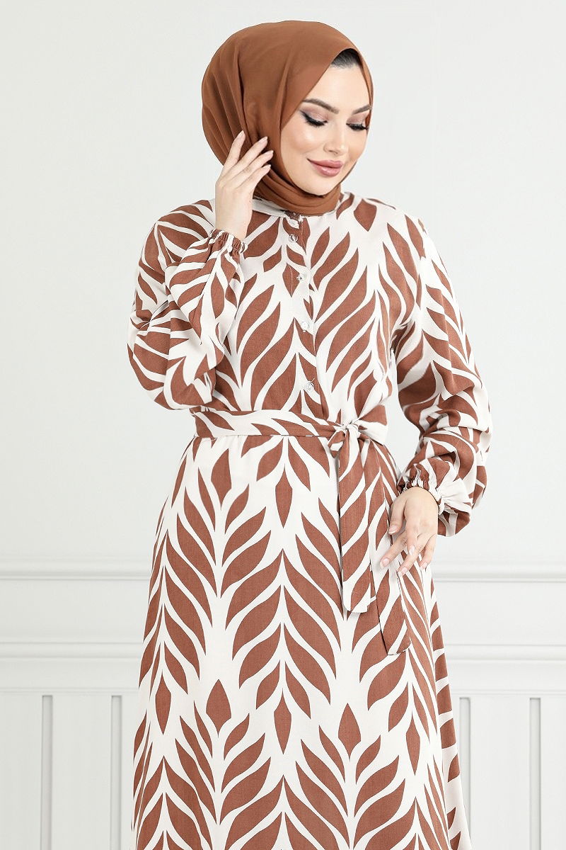 Yaprak Desenli Tesettür Elbise 827OZR1047-M Taba
