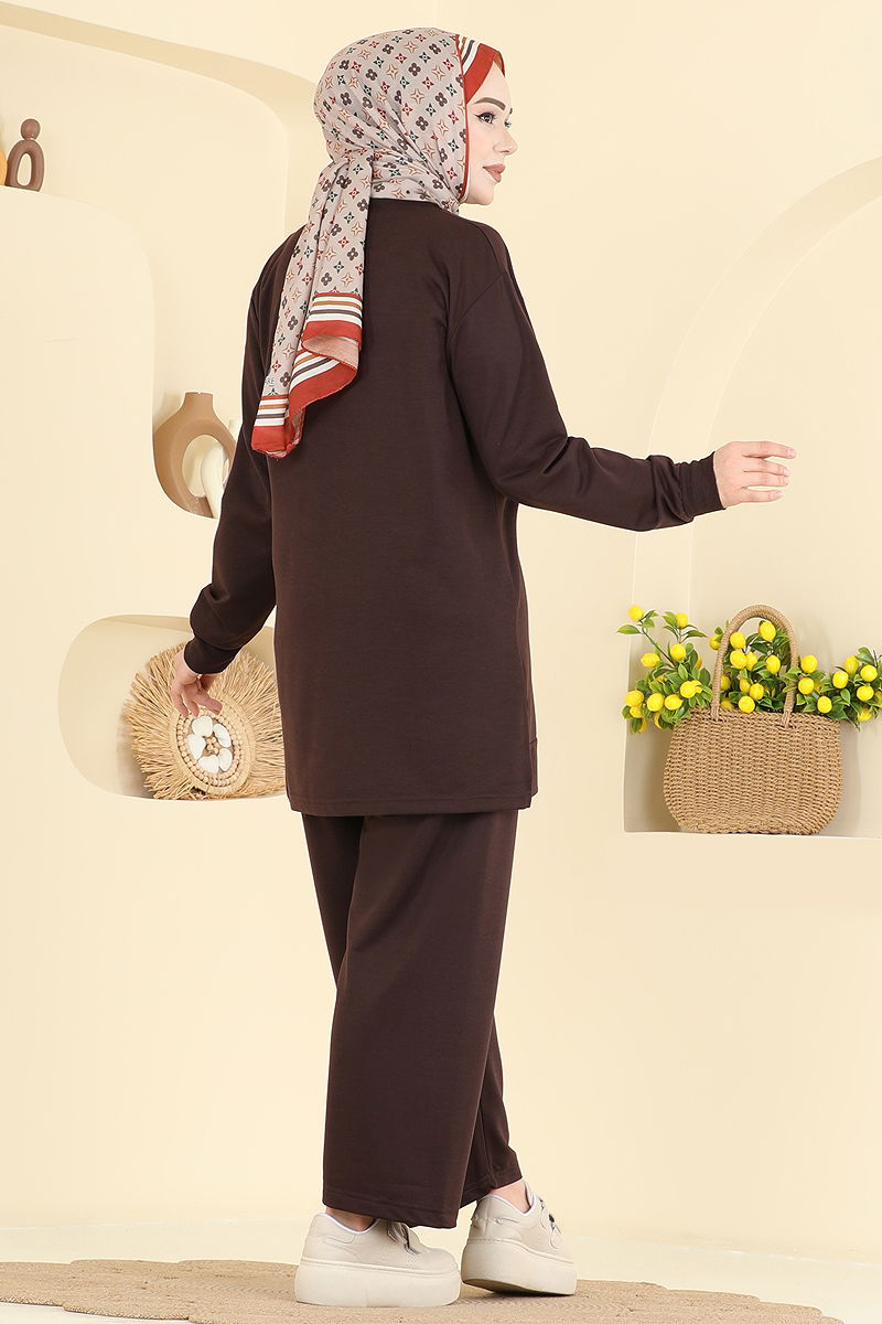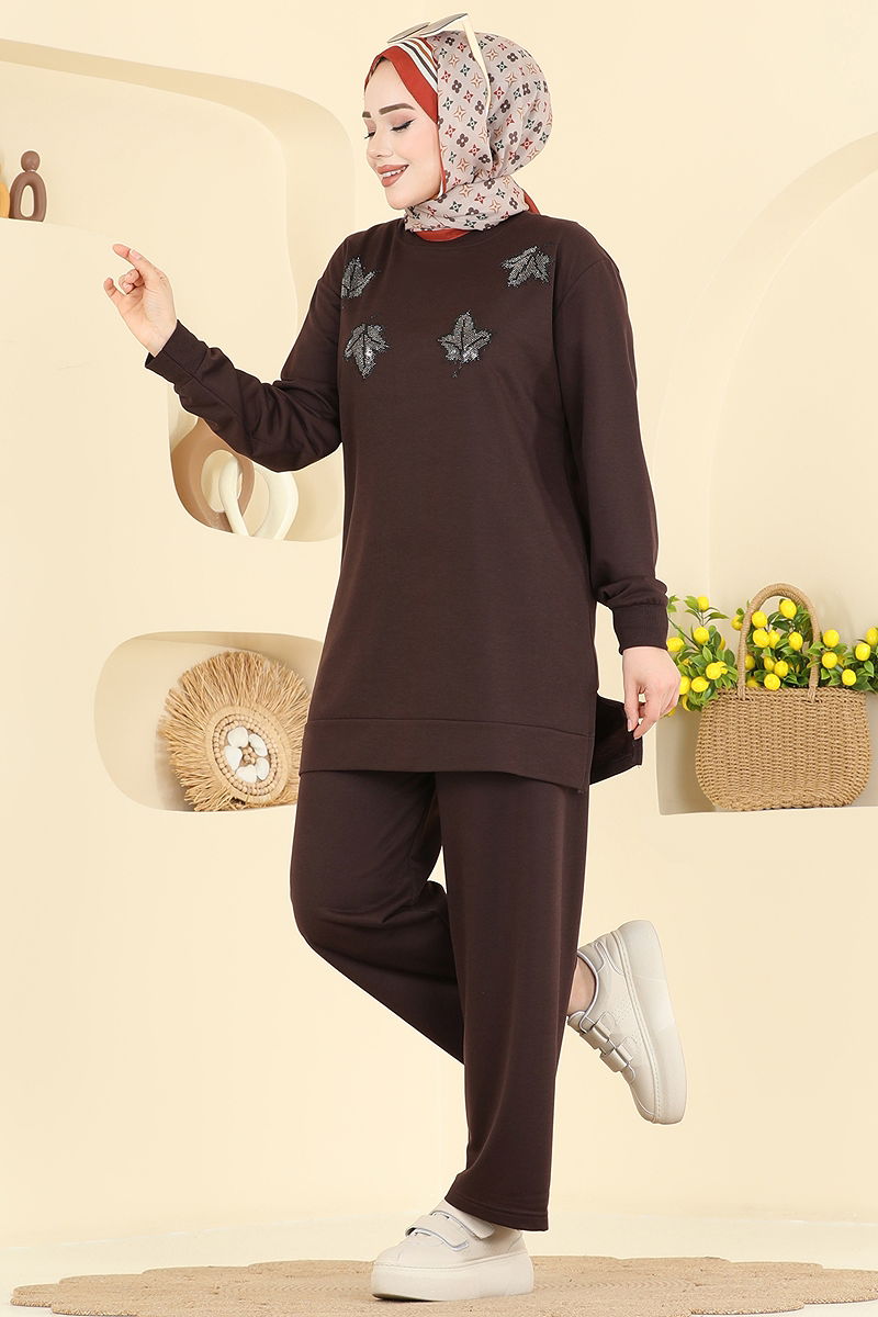 Yaprak İşlemeli Pantolonlu Takım Kahve