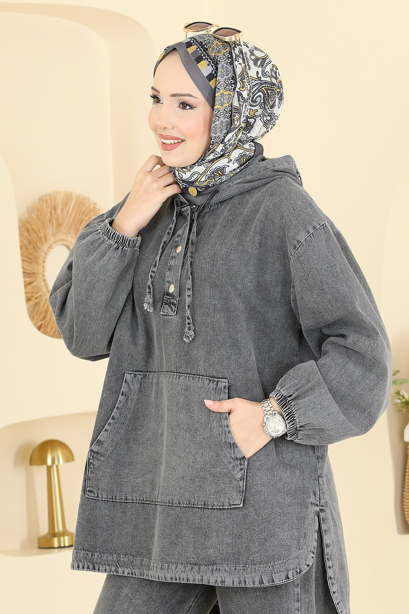 Yarım Çıtçıtlı Kot Takım model, tesettür giyim tarzına uygun dört mevsim rahatlıkla kullanılabilir bir üründür. Hassas yıkama ile 30 derecede yıkanabilen bu takım, dayanıklı kot kumaşından üretilmiştir. Kapşonlu yaka ve çıtçıtlı detayları ile modern bir görünüme sahiptir. Tunik ceplidir, pantolonun beli elastiktir ve rahat bir kullanım sunar. Manşetleri lastikli olan bu takım, şık ve konforlu bir stil arayanlar için idealdir.
