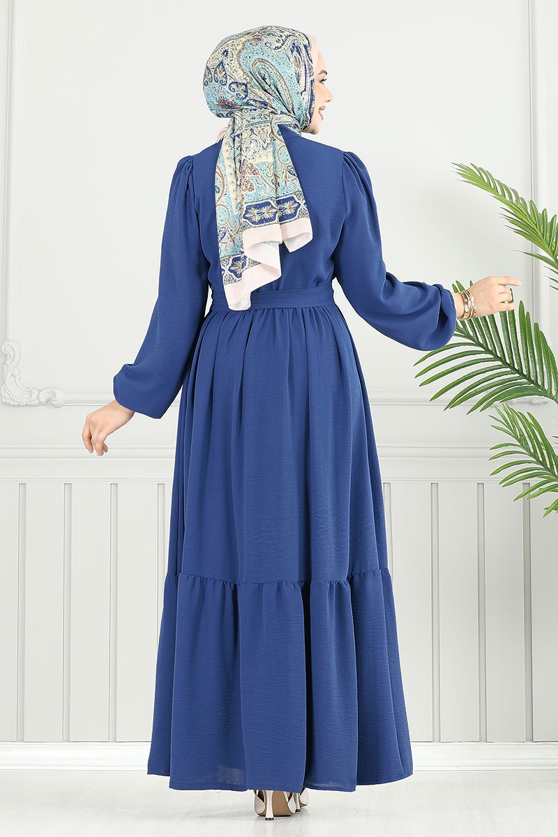 Yarım Düğmeli Aerobin Elbise, özel aerobin kumaşından üretilmiş, dört mevsim rahatlıkla kullanabileceğiniz bir tesettür modelidir. Hassas yıkama programında 30 derecede yıkanabilen bu elbise, yarım hakim yaka tasarımına ve önden yarım düğmeli bir yapıya sahiptir. Astarsız olan bu modelin bel kısmı dikişli olup, kemerle birlikte gelmektedir; kemer, iki ucu dikilmiş ve ortası dikişsiz bırakılarak tasarlanmıştır. Manşetler lastiklidir ve elbise kolaylıkla günlük ya da özel kullanıma uygun şekilde stil sahibi bir görünüm sunar. Modelin üzerindeki ürün 38 bedendir.