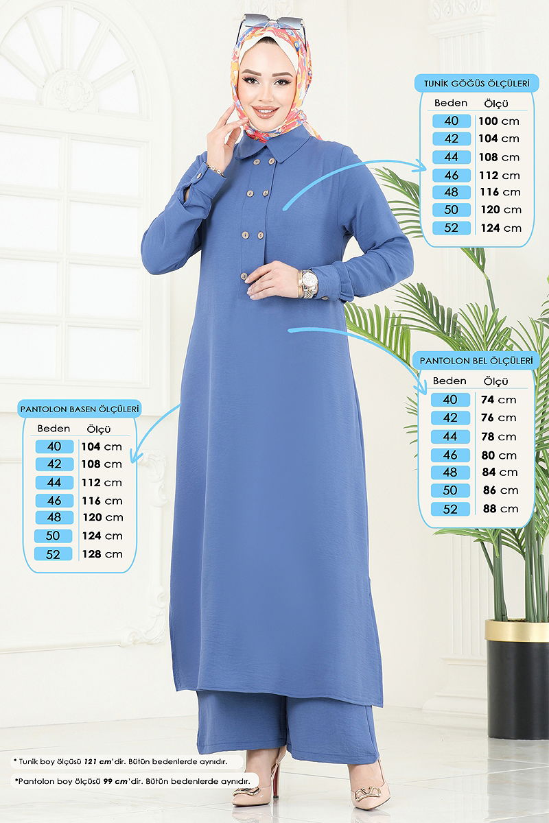 Ürün Özelliği : Yeni sezon tesettür moda ürünüdür. Ürün Gömlek yakadır. Ürün Önden kullanılabilir yarım düğmelidir. Tunik yandan yırtmaçlıdır.. Astarsızdır. Pantolon beli lastiklidir. Manşet düğmeleri aktiftir.Konsept fotoğraf çekimlerinden dolayı üründe ton farklılığı olabilir.