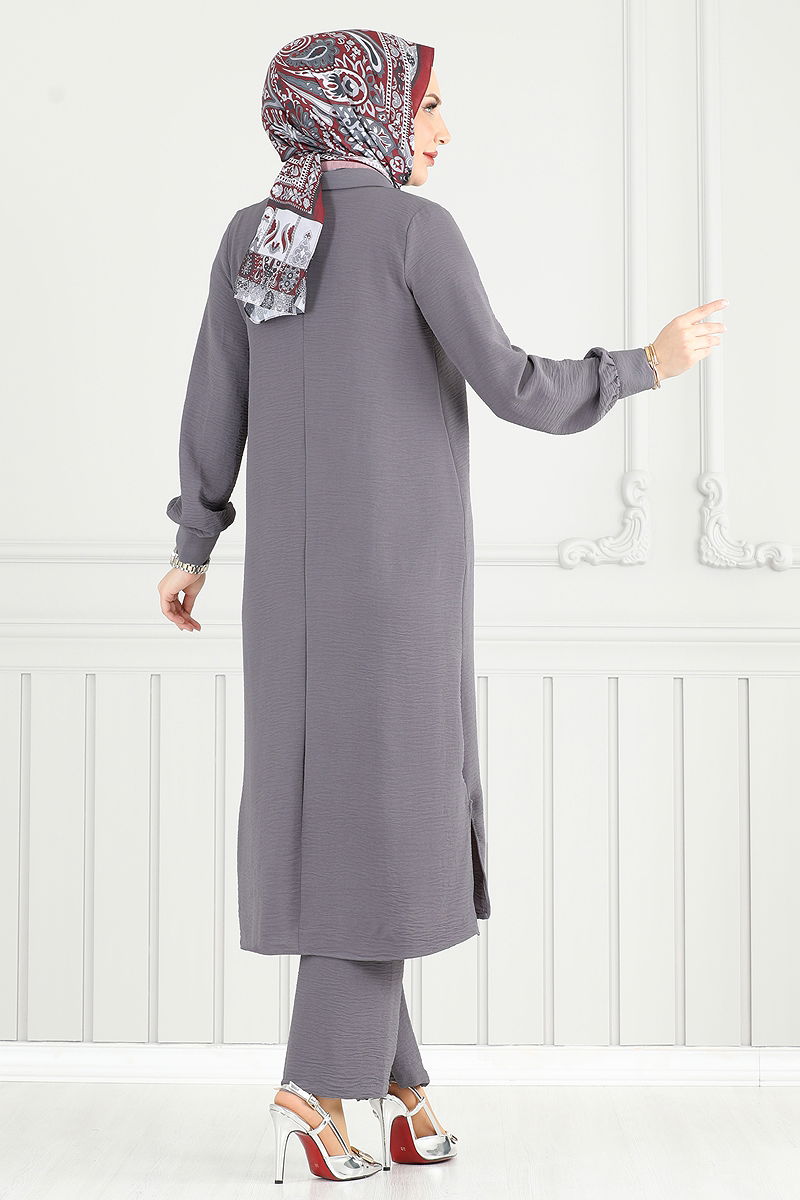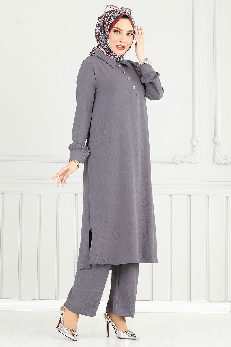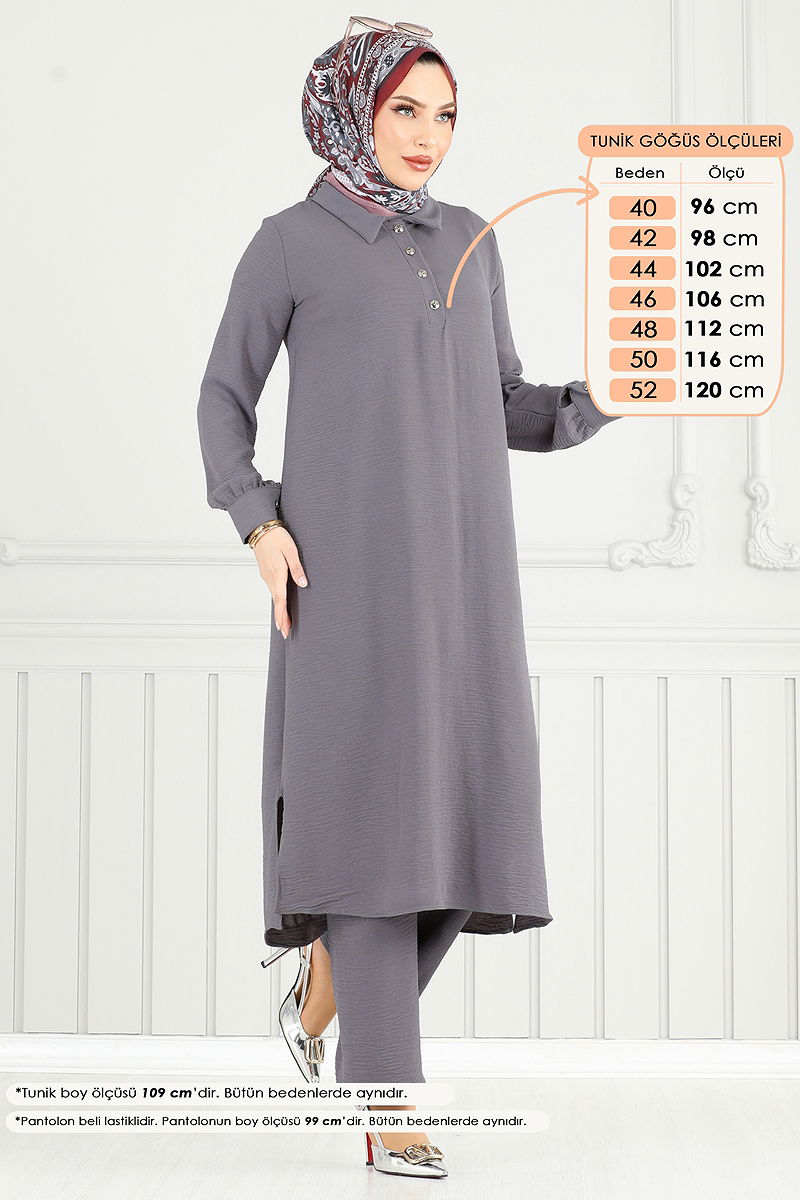 Ürün Özelliği : Yeni sezon tesettür moda ürünüdür. Ürün Gömlek yakadır. Ürün Önden kullanılabilir yarım düğmelidir. Tunik yandan yırtmaçlıdır.. Astarsızdır. Pantolon beli lastiklidir. Manşet düğmeleri aktiftir. Konsept fotoğraf çekimlerinden dolayı üründe ton farklılığı olabilir.