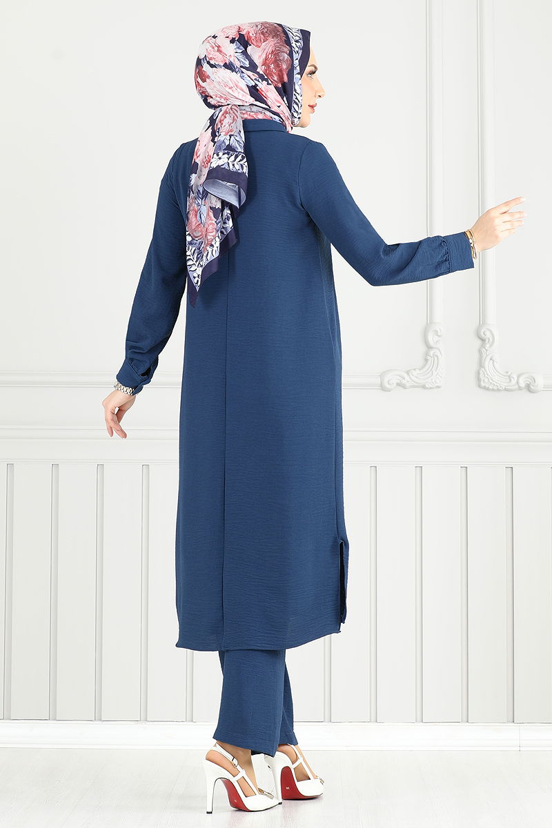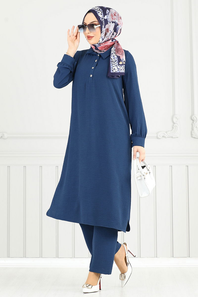 Ürün Özelliği : Yeni sezon tesettür moda ürünüdür. Ürün Gömlek yakadır. Ürün Önden kullanılabilir yarım düğmelidir. Tunik yandan yırtmaçlıdır.. Astarsızdır. Pantolon beli lastiklidir. Manşet düğmeleri aktiftir. Konsept fotoğraf çekimlerinden dolayı üründe ton farklılığı olabilir.