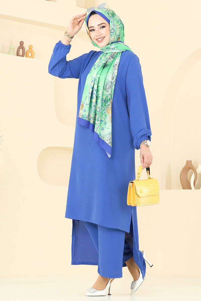 The Half-Buttoned Set is a model modest wear suitable for all seasons. Made from Aerobin fabric, this set features a semi-mandarin collar and practical half-buttons on the front, offering a contemporary look. The tunic has stylish side slits, and the trousers have an elastic waist for your comfort. This garment can be washed at 30 degrees without spinning (delicate wash) and is unlined for a light and comfortable fit. The model shown is wearing a size 38-40, demonstrating the ideal fit.