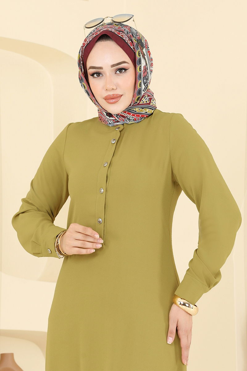 Yarım Düğmeli Aerobin Tunik, özel tasarımı ve rahatlığı ile dört mevsim kullanıma uygun bir tesettür tuniktir. 30 derecede hassas yıkama programında yıkanabilir olan bu tunik, aerobin kumaştan üretilmiştir ve uzun ömürlü kullanım sunar. Yarım hakim yakası ve ön tarafında bulunan yarım düğmeleri ile hem şık hem de pratik bir kullanım sağlar. Astarsız yapısı ile hafif ve konforlu bir deneyim sunarken, manşetlerindeki aktif düğmeler fonksiyonellik katmaktadır. Bu tunik, herhangi bir mevsimde ideal konfor ve stil arayanlar için mükemmel bir seçimdir.