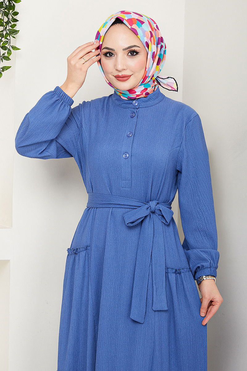 Yarım Düğmeli Bürümcük Elbise 402DVL897-M İndigo