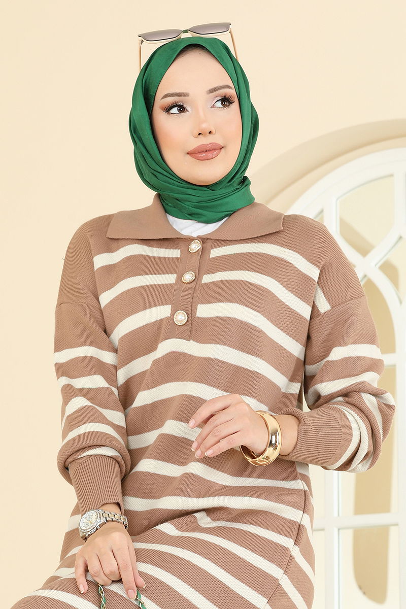 Yarım Düğmeli Çizgili Triko Elbise 502OZN1046 Bisküvi
