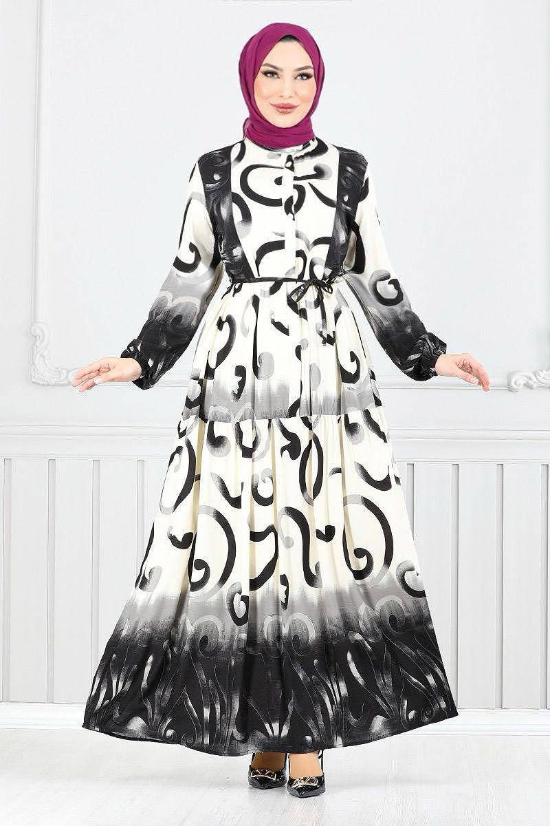 Yarım Düğmeli Desenli Elbise 0208ASN936-M Siyah