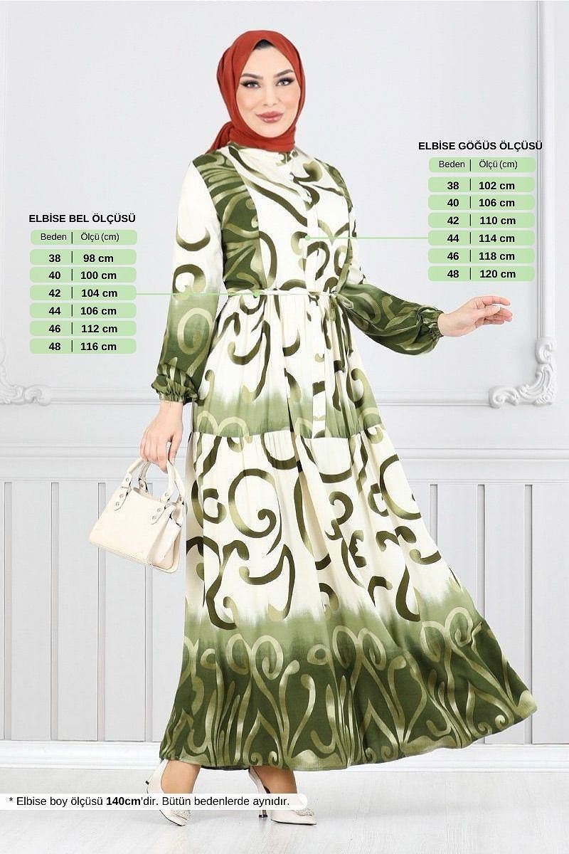 Yarım Düğmeli Desenli Elbise 0208ASN936-M Yeşil