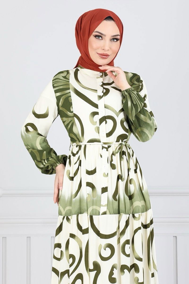 Yarım Düğmeli Desenli Elbise Yeşil