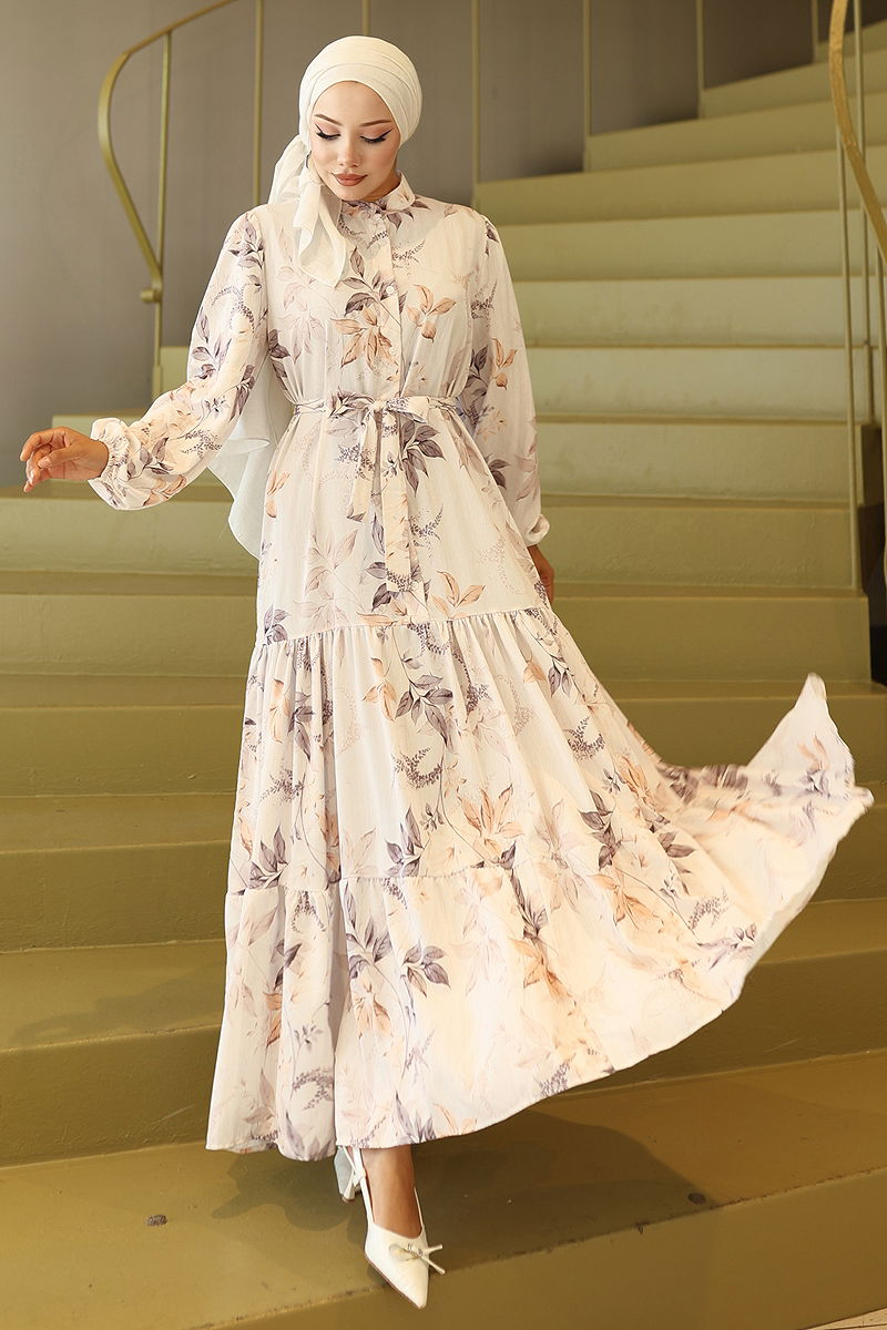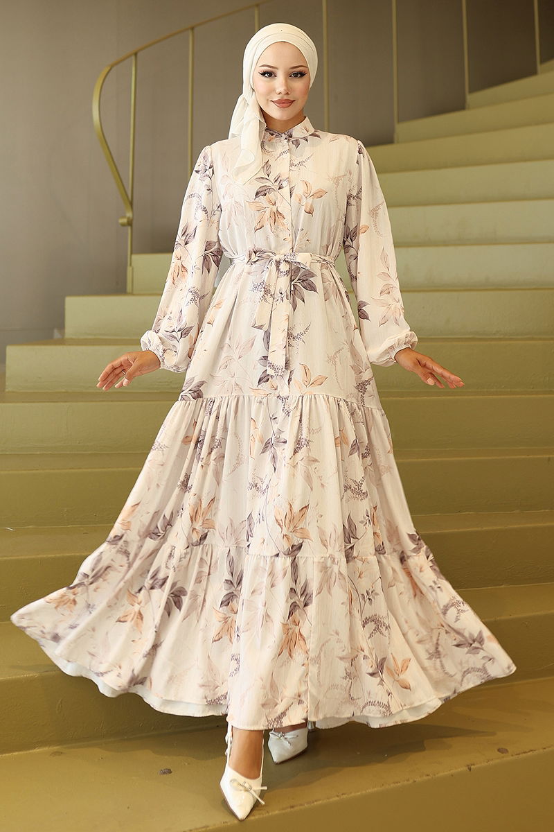 Yarım Düğmeli Desenli Elbise Bej