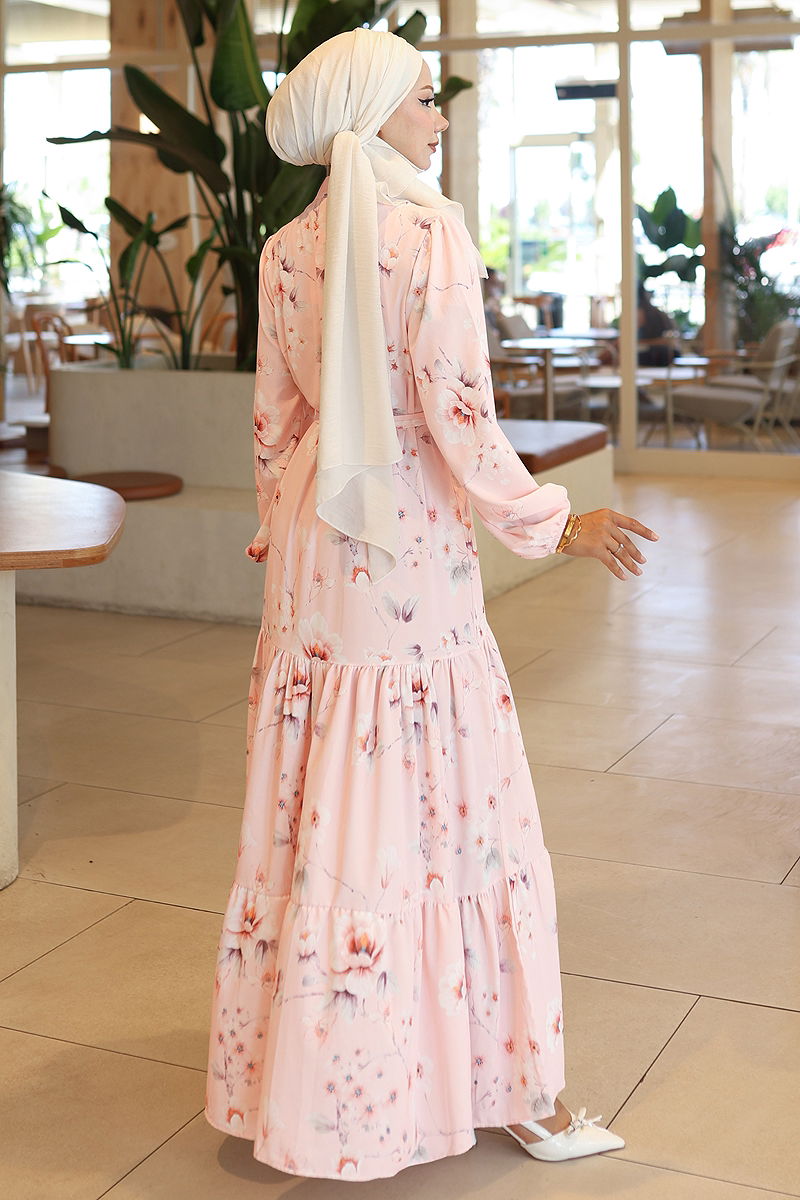 Yarım Düğmeli Desenli Elbise 563BRZK1151 Pudra