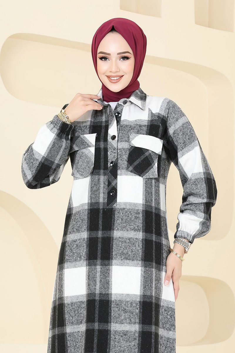 Yarım Düğmeli Ekose Tunik model tesettür ürünüdür. Sonbahar ve Kış sezonunda kullanılabilir. 30 DERECEDE SIKTIRILMADAN YIKANABİLİR.(HASSAS YIKAMA) Ekose kumaştan imal edilmiştir. Ürün Gömlek yakadır. Ürün Önden kullanılabilir yarım düğmelidir. Astarsızdır. (Modelin üzerindeki ürün 38 bedendir.) Manşet lastiklidir.