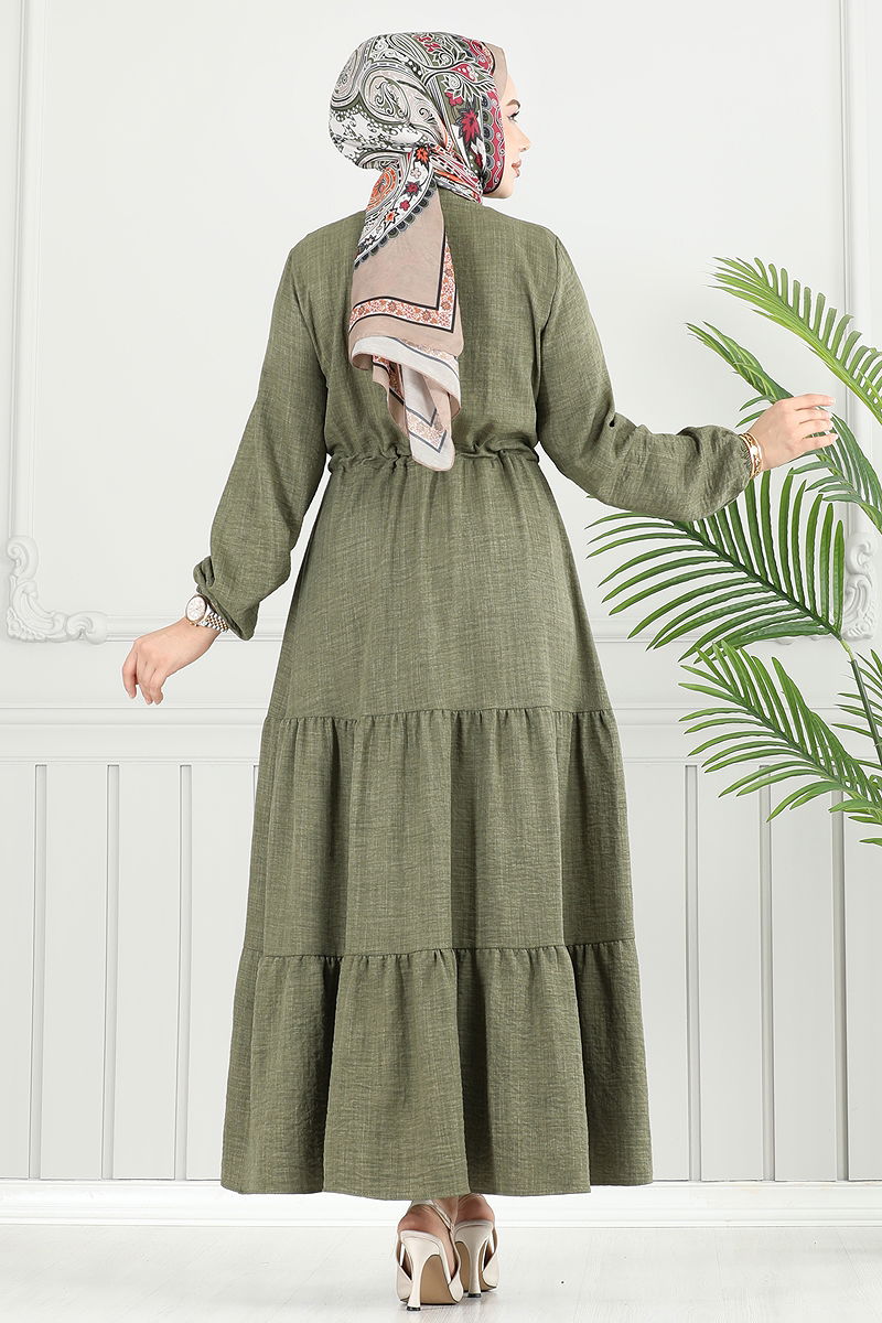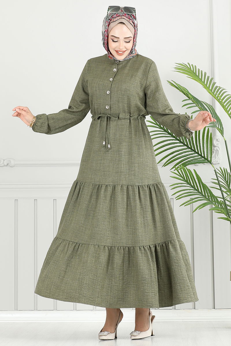 The Half-Buttoned Dress is a modest wear model suitable for all seasons. Washable at 30 degrees on gentle cycle, this elegant dress is made from sofia linen fabric. It has a semi-mandarin collar and front button details. The unlined model has elastic cuffs, and it comes with an attached belt, offering both comfort and style. The product shown on the model is size 38.