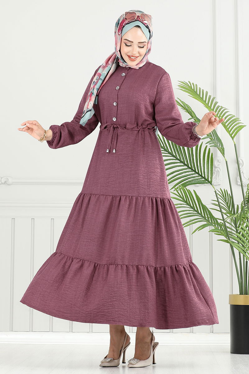 Yarım Düğmeli Elbise Koyu Gül Kurusu