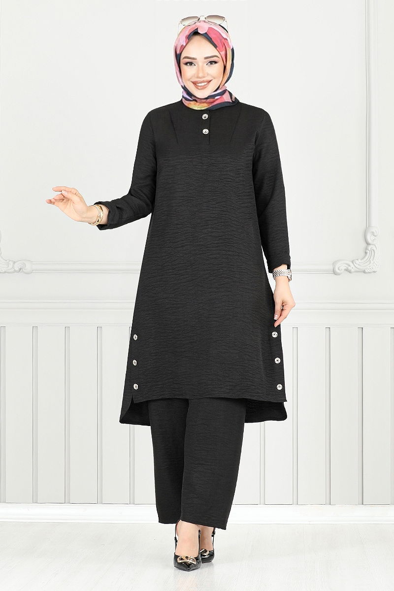 Yarım Düğmeli Keten Takım 018MR1077-M Siyah