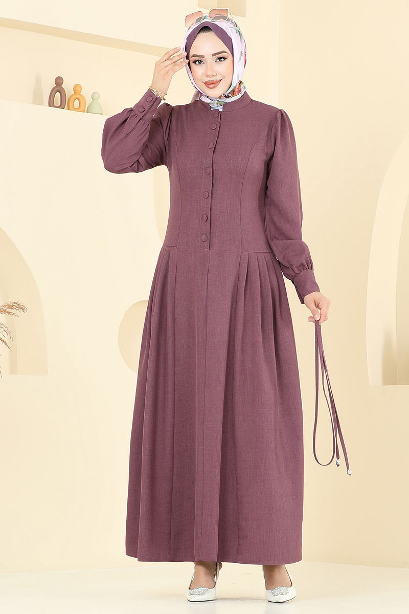 The Half-Buttoned Sofia Dress is a specially designed modest wear suitable for all seasons. Made from linen fabric, this dress should be washed at 30 degrees on a gentle cycle. It features a semi-mandarin collar and a front half-button design that offers a modern and stylish look. The unlined structure makes it lightweight and comfortable. The included belt is carefully stitched to prevent waving and its use is optional. Active cuff buttons add functionality.