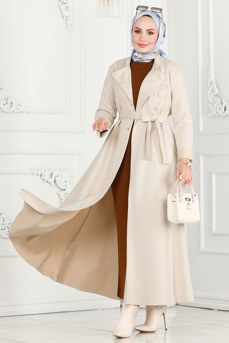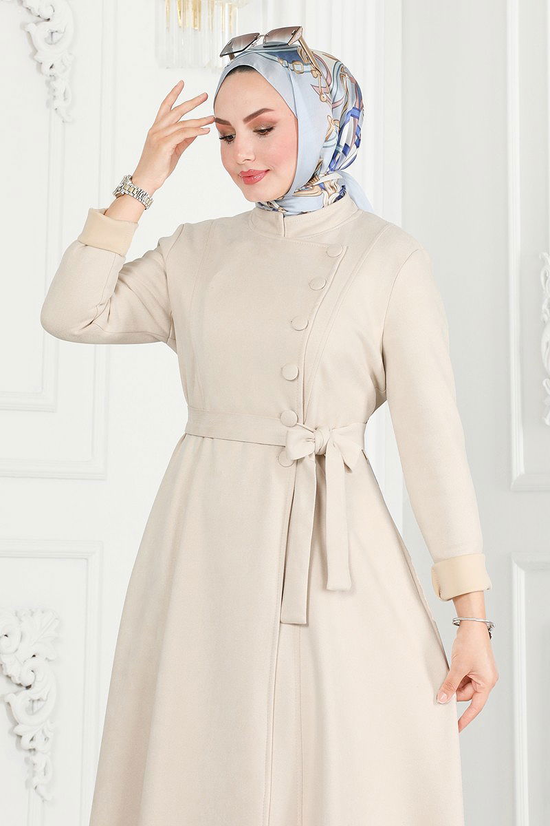 Half-Buttoned Abaya model is a modest fashion item designed for autumn and winter season. It should be washed at 30 degrees without wringing. Made of first-class suede fabric, it features a half mandarin collar and can be used as a front half-buttoned piece without lining. The product on the model is size 38. The two ends of the belt are sewn to prevent fluttering, leaving the middle part seamless. The belt is included with the product and can be optionally used. It has a pocket detail.