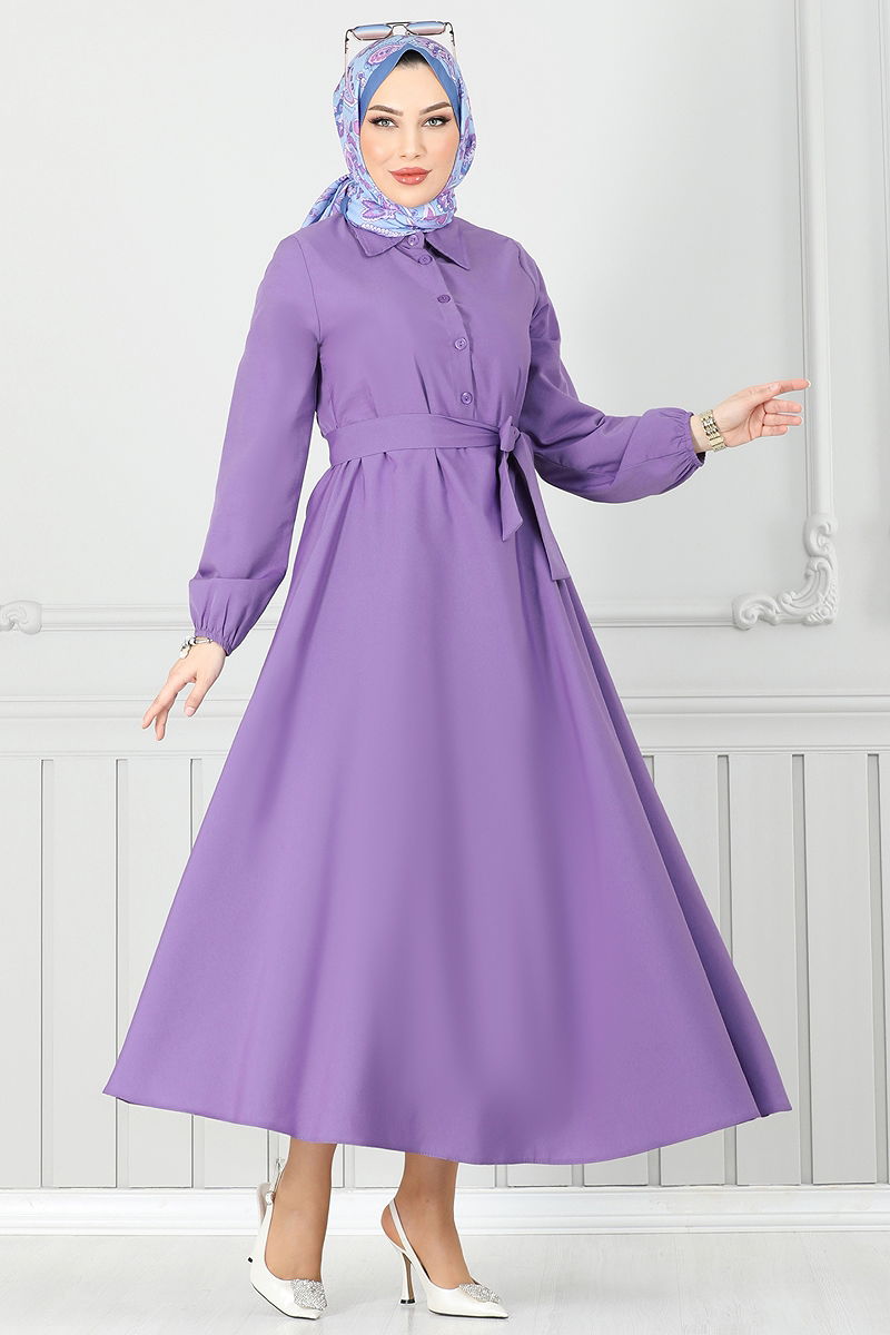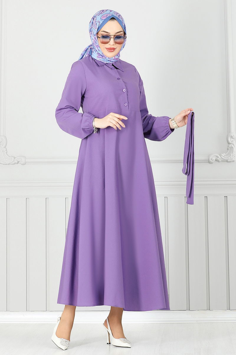 Yarım Düğmeli Terikoton Elbise Koyu Lila