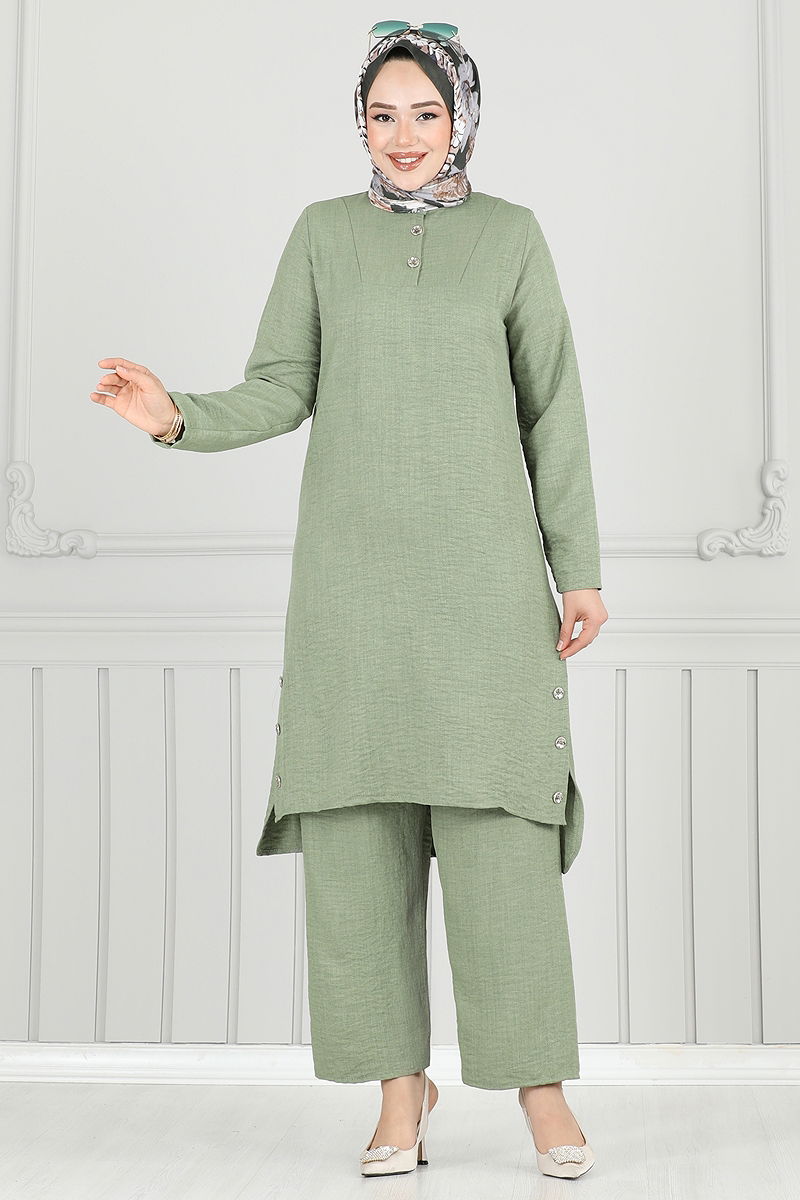 Yarım Düğmeli Tesettür Takım, modası asla geçmeyecek bir ürün! Dört mevsim rahatlıkla giyilebilen bu takım, hassas yıkama özelliği ve 30 derecede yıkanabilme kolaylığı sunar. Sofia Keten kumaşı sayesinde uzun ömürlü ve şık bir kullanım vadediyor. Yarım Hakim yaka ve yarım düğmeli tasarımı ile pratikliği ve zarafeti bir arada sunan bu kombin, aksesuar olarak tasarlanmış yırtmaç düğmelere sahiptir. Astarsız yapısı ile hafif ve konforlu bir alternatif sunar. Tunik ve pantolonun elastik beli, gün boyu rahat bir kullanım sağlar.