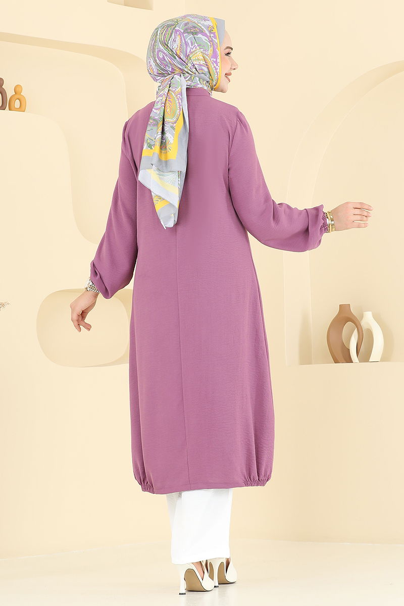 Düğme Detaylı Tesettür Kombin; dört mevsim rahatlıkla kullanılabilir bu şık tasarım, aerobin kumaştan üretilmiştir. Hassas yıkama ile 30 derecede yıkanabilir özelliğe sahiptir. Yarım hakim yaka ve önünde yarım düğmeli tasarımıyla modern bir görünüm sunar. Tunik etek ucu ve pantolon manşetinde lastik detaylar bulunurken, bağcık ve fermuar detayları ise sadece aksesuar olarak eklenmiştir. Bu kombin, rahatlığı ve şıklığı bir arada sunuyor.
