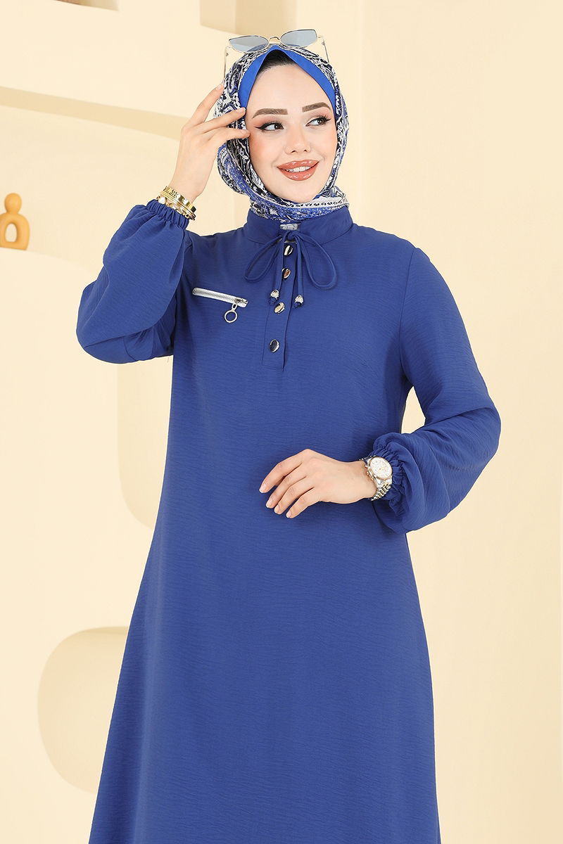 Düğme Detaylı Tesettür Kombin; dört mevsim rahatlıkla kullanılabilir bu şık tasarım, aerobin kumaştan üretilmiştir. Hassas yıkama ile 30 derecede yıkanabilir özelliğe sahiptir. Yarım hakim yaka ve önünde yarım düğmeli tasarımıyla modern bir görünüm sunar. Tunik etek ucu ve pantolon manşetinde lastik detaylar bulunurken, bağcık ve fermuar detayları ise sadece aksesuar olarak eklenmiştir. Bu kombin, rahatlığı ve şıklığı bir arada sunuyor.