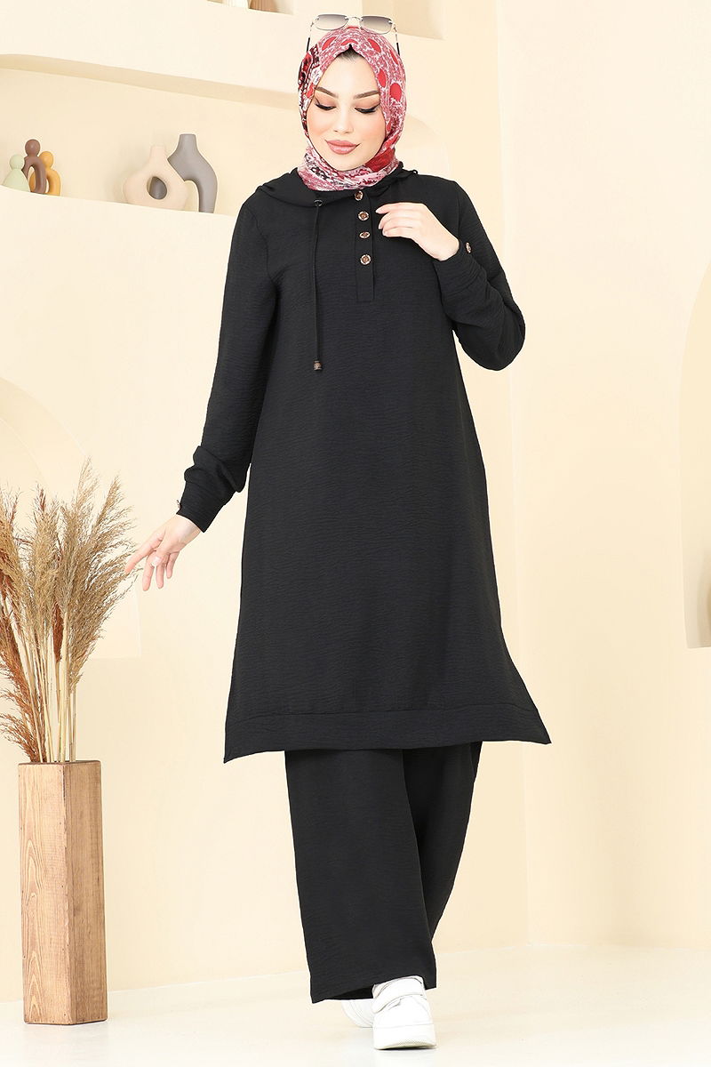 Yarım Düğmeli Tesettür Takım , dört mevsim rahatlıkla kullanabileceğiniz, aerobin kumaşa sahip bir set olarak öne çıkıyor. Hassas yıkama ile 30 derecede yıkanabilen bu ürün, pratik ve şık bir kullanım sunar. Kapşonlu yaka tasarımı ve ön yüzünde yer alan yarım düğmeler ile modern bir görünüme kavuşurken, yırtmaçlı tuniği ve lastikli pantolon beli ile gün boyu konfor sağlar. Hem günlük kullanım hem de özel günleriniz için ideal olan bu takım, tesettür giyimde şıklığı ve rahatlığı bir arada sunuyor.