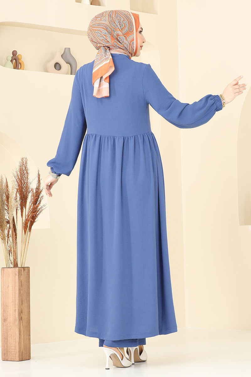 Çok yönlü ve şık görünümlü Yarım Düğmeli Tesettür Takım, dört mevsim rahatlıkla tercih edebileceğiniz ideal bir seçenektir. Hassas yıkama koşuluyla 30 derecede yıkanabilen bu takım, aerobin kumaştan üretilmiştir ve uzun ömürlü kullanım vaat eder. Tunik, ön yırtmaç detayına sahipken, yarım düğme tasarımı ile pratik bir kullanım sunar. Hakim yaka detayı şıklığına şıklık katar. Pantolonu lastik bel ve manşet lastikli olup, konforunuzu artırır. Bluz dahil değildir ancak görseldeki kombin önerisi ile stilinizi tamamlayabilirsiniz.