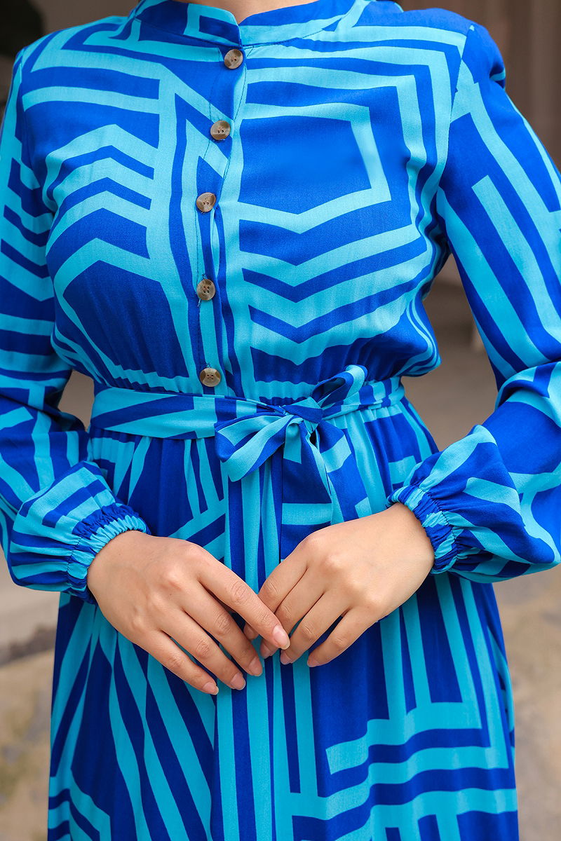 Yarım Düğmeli Viskon Elbise, dört mevsim sezonunda kullanılabilen tesettür bir üründür. Viskon kumaştan imal edilen elbise bisiklet yakalıdır ve önden yarım düğmeli kullanımı vardır. Astarsız olan elbisenin modelin üzerindeki ürün 38 bedendir. Boy: 160 cm, Göğüs: 86 cm, Bel: 68 cm, Basen: 95 cm, Kilo: 55 kg. Kemerin dalgalanmaması için iki ucu dikilmiş, orta kısım boş (dikişsiz) bırakılmıştır. Kemer ürüne dahildir, isteğe bağlı kullanılmayabilir. Manşet lastiklidir.