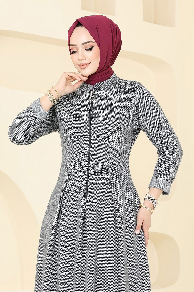 Yarım Fermuarlı Balıksırtı Elbise Gri