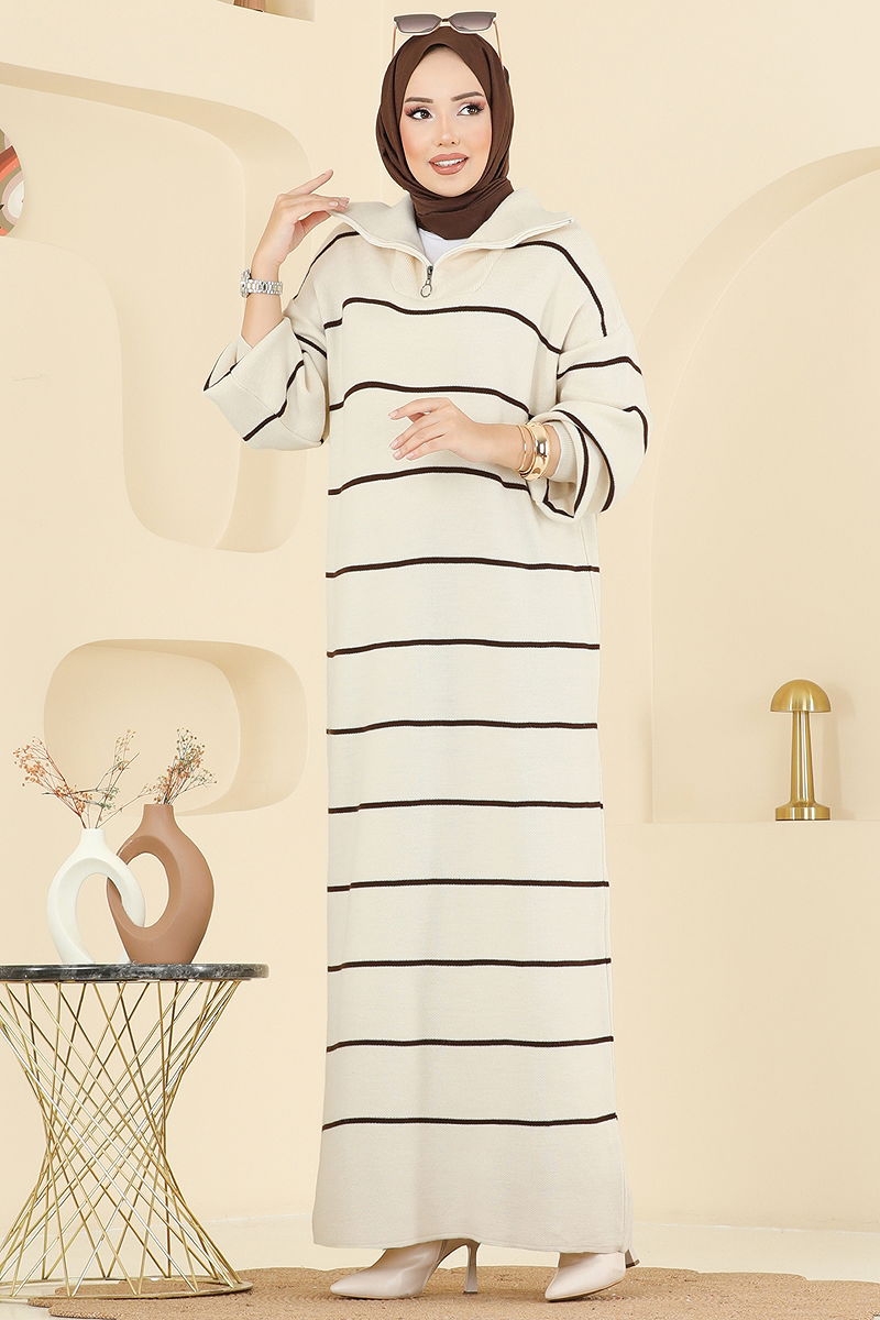 Yarım Fermuarlı Çizgili Elbise Ekru