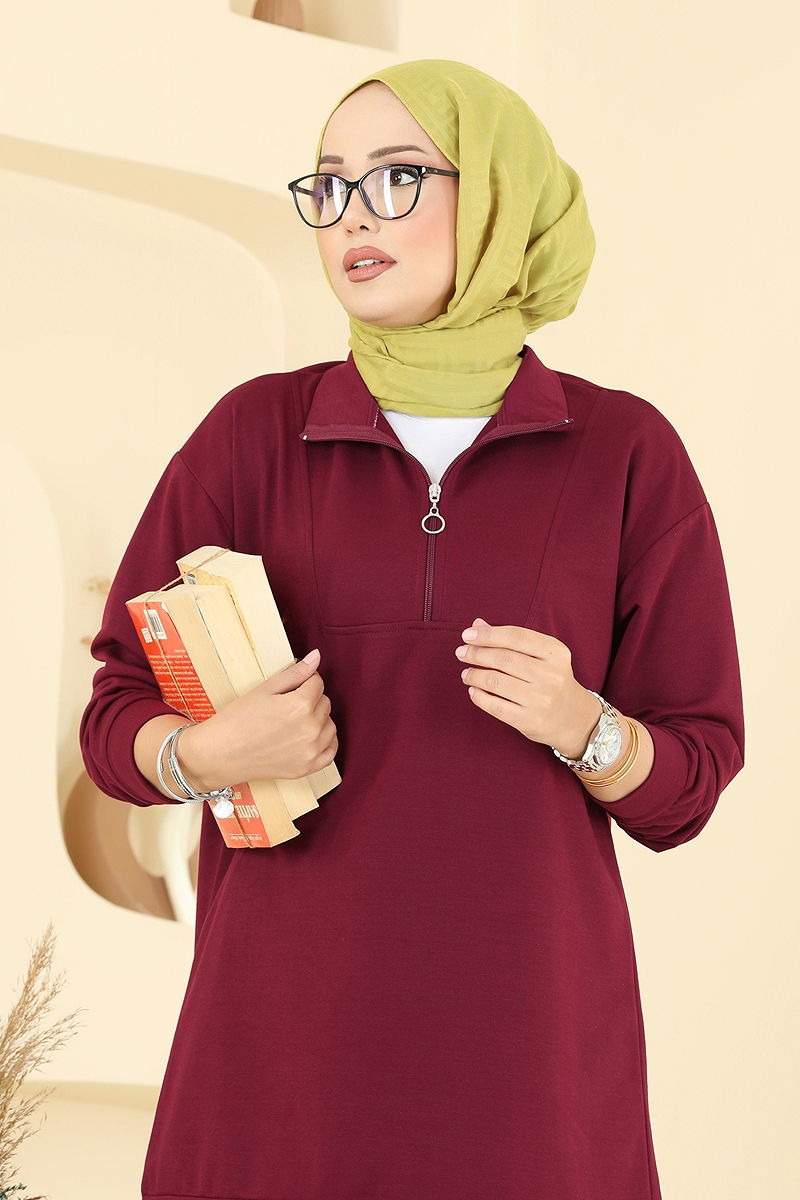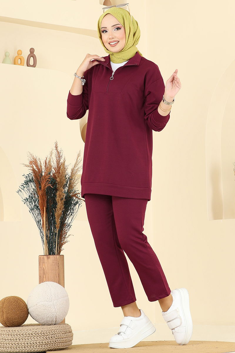 The Half-Zip Two-Thread Suit COMBO is a chic product reflecting modest fashion, suitable for all seasons. Made from two-thread fabric, this set can be gently washed at 30 degrees. The half-zip on the tunic provides ease of use, while the elastic waist on the trousers ensures a comfortable fit. With its upright collar, it offers a modern look, maintaining your elegance in any setting.