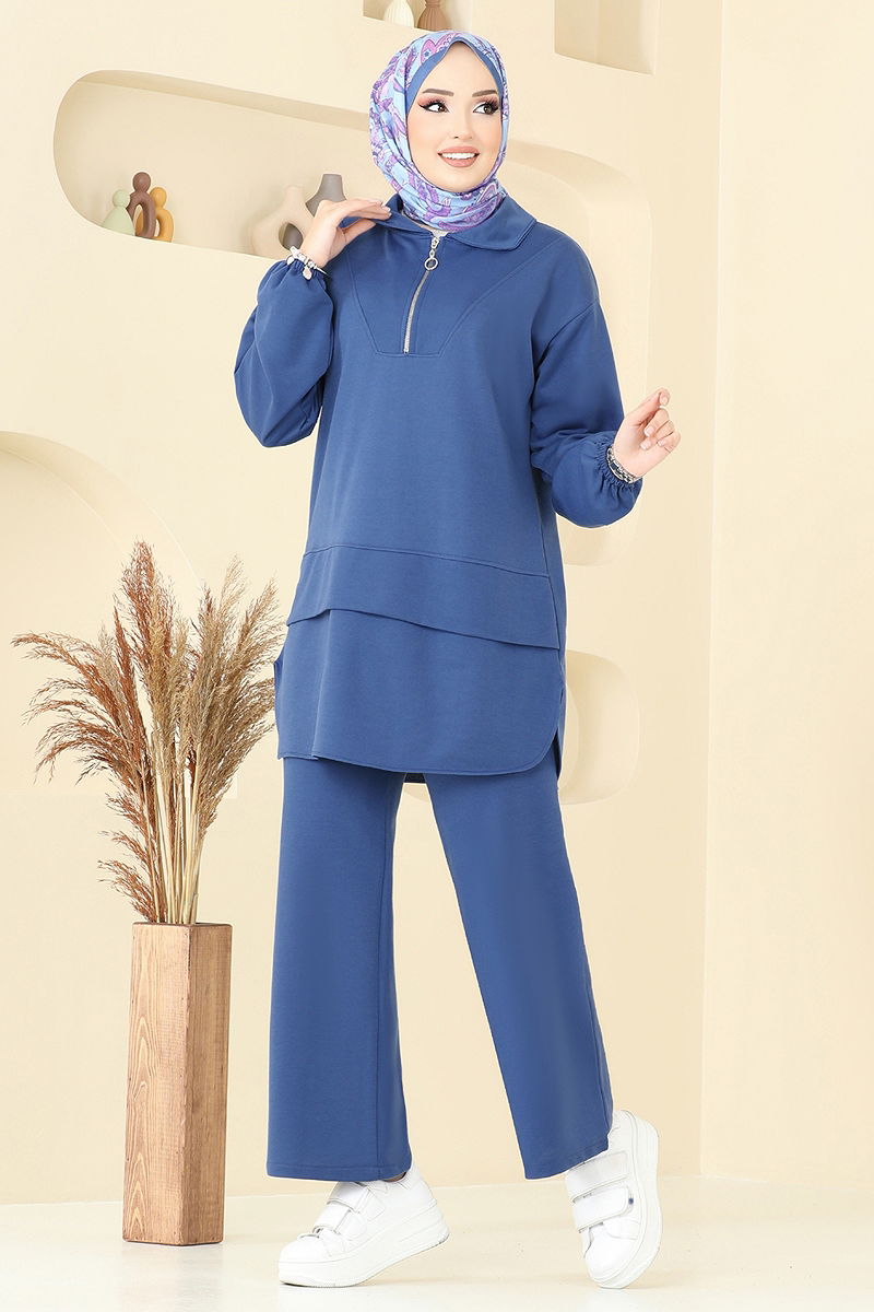 Yarım Fermuarlı İkili Takım modeli, tesettür giyime özel tasarlanmış dört mevsim rahatlıkla kullanabileceğiniz bir üründür. 30 derecede hassas yıkama ile temizlenebilir özelliği, iki iplik kumaş kalitesi ve gömlek yakası ile modern ve şık bir görünüm sunar. Tunik yan yırtmaç detayı ile hareket özgürlüğü sağlarken, pantolonun elastik beli ve manşetleri gün boyu konfor sunar. Fermuar detayı ise stil sahibi bir kullanım sağlar.