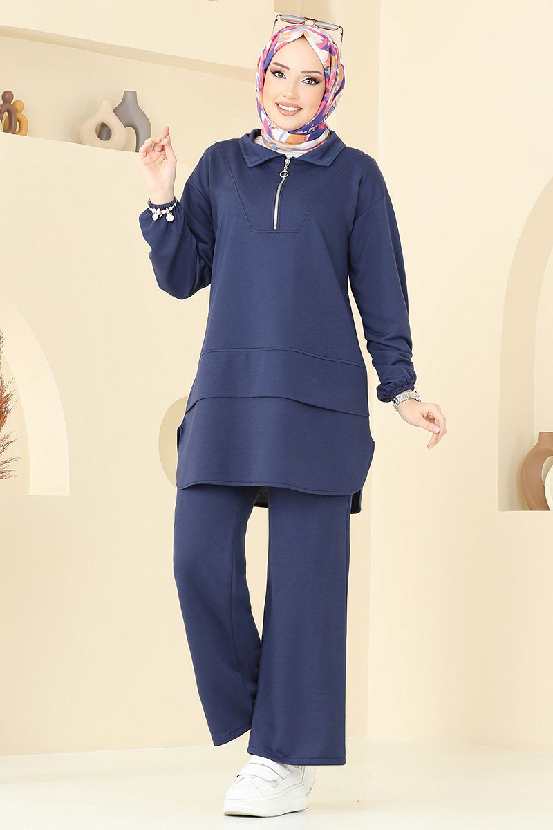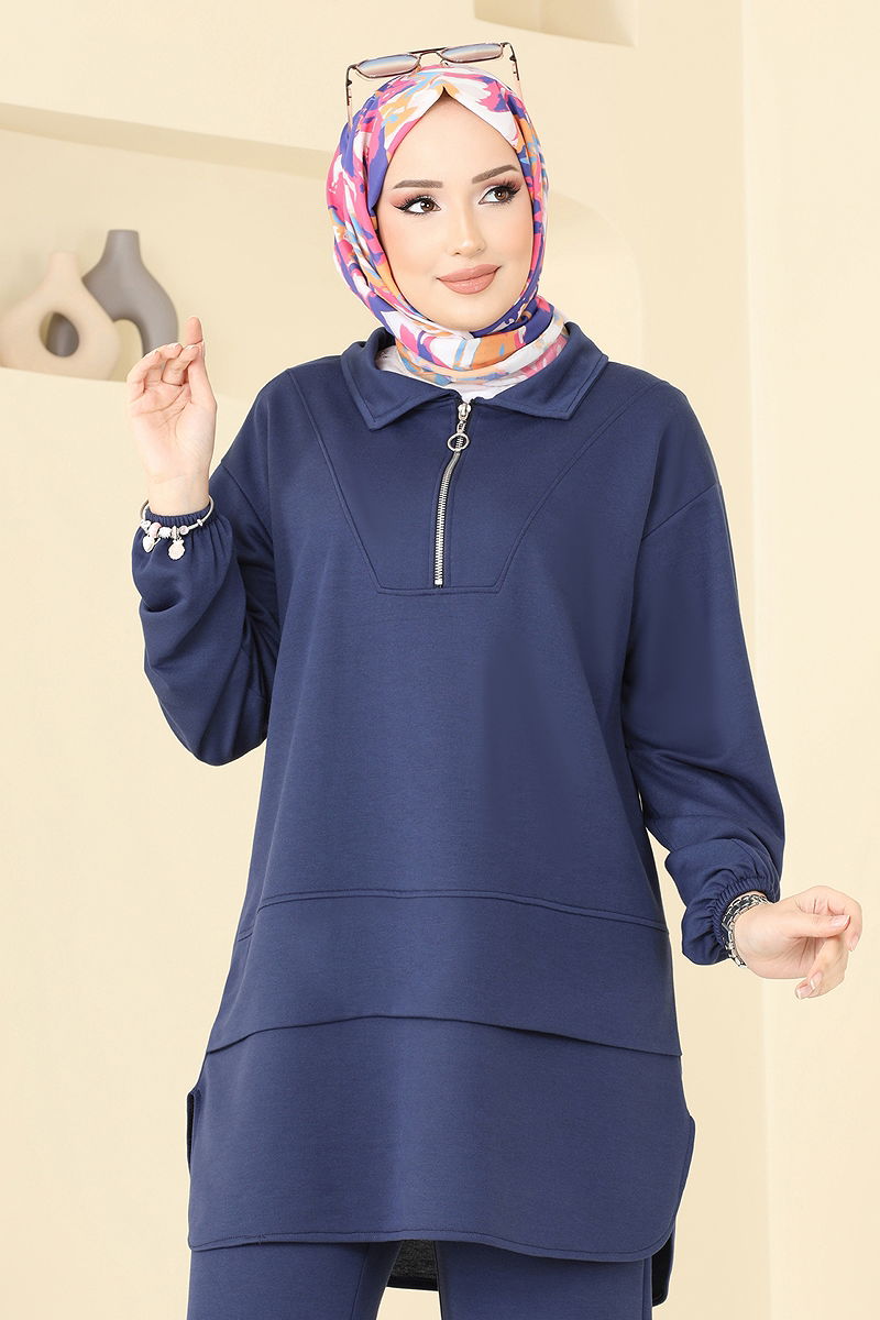 Yarım Fermuarlı İkili Takım modeli, tesettür giyime özel tasarlanmış dört mevsim rahatlıkla kullanabileceğiniz bir üründür. 30 derecede hassas yıkama ile temizlenebilir özelliği, iki iplik kumaş kalitesi ve gömlek yakası ile modern ve şık bir görünüm sunar. Tunik yan yırtmaç detayı ile hareket özgürlüğü sağlarken, pantolonun elastik beli ve manşetleri gün boyu konfor sunar. Fermuar detayı ise stil sahibi bir kullanım sağlar.