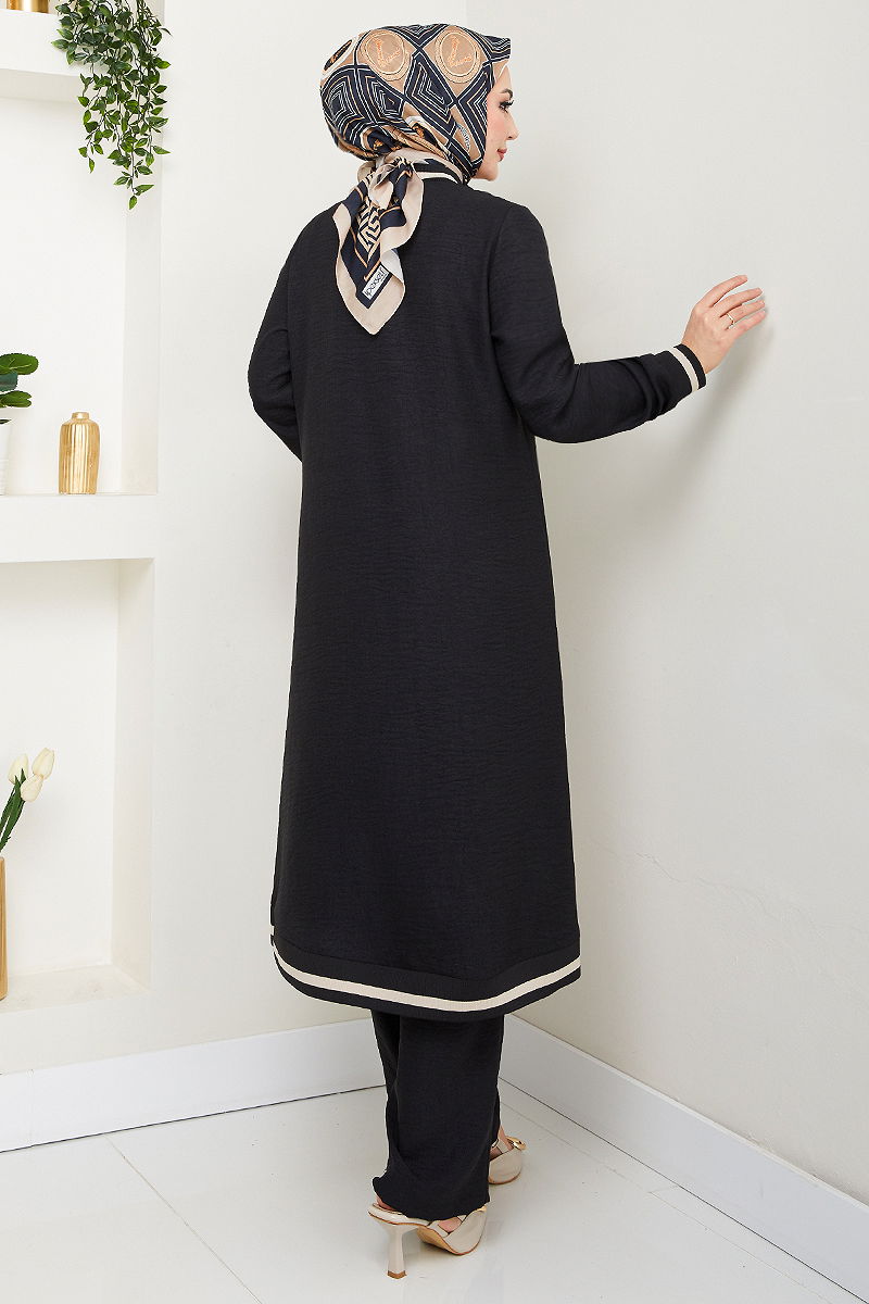 The Half-Zip Linen Suit KOMBİN is a modest wear piece ideal for all seasons. Crafted from Sofia linen fabric, this suit can be gently washed at 30 degrees. Featuring a semi-mandarin collar and an unlined design, it has a practical front zipper for ease of use. The trousers have an elastic waist for maximum comfort. Its stylish combination of tunic and trousers will become an essential part of your wardrobe.