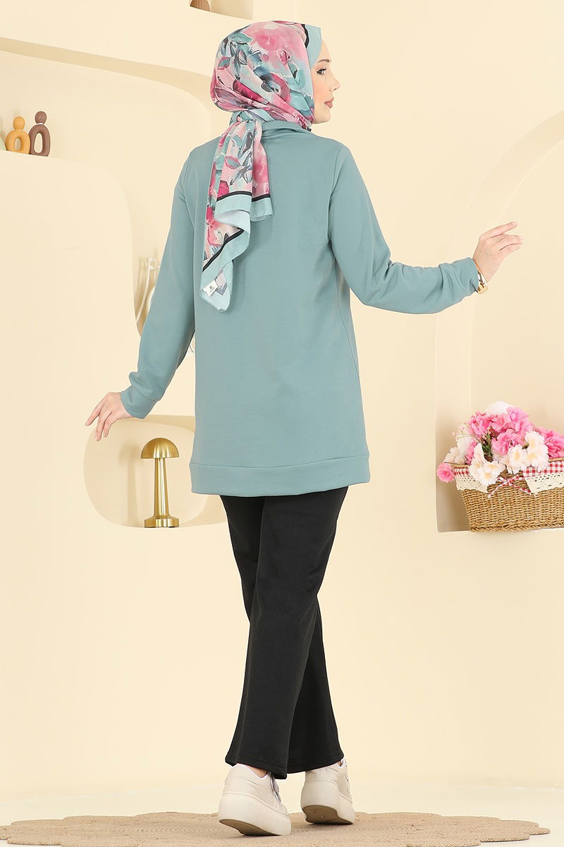 Yarım Fermuarlı Spor Takım model tesettür ürünüdür. Dört Mevsim sezonunda kullanılabilir. 30 derecede sıkma yapılmadan yıkanmalıdır. Birinci sınıf İki İplik kumaştan imal edilmiştir. Ürün Hakim yakadır. Astarsızdır. (Modelin üzerindeki ürün 38 bedendir.) Önden kullanılabilir yarım fermuarı bulunmaktadır. Metal aksesuar ürüne dikilidir. Pantolon beli lastiklidir.