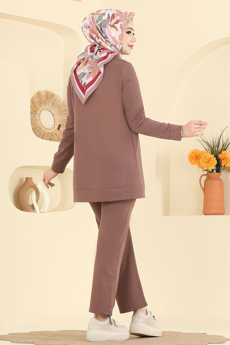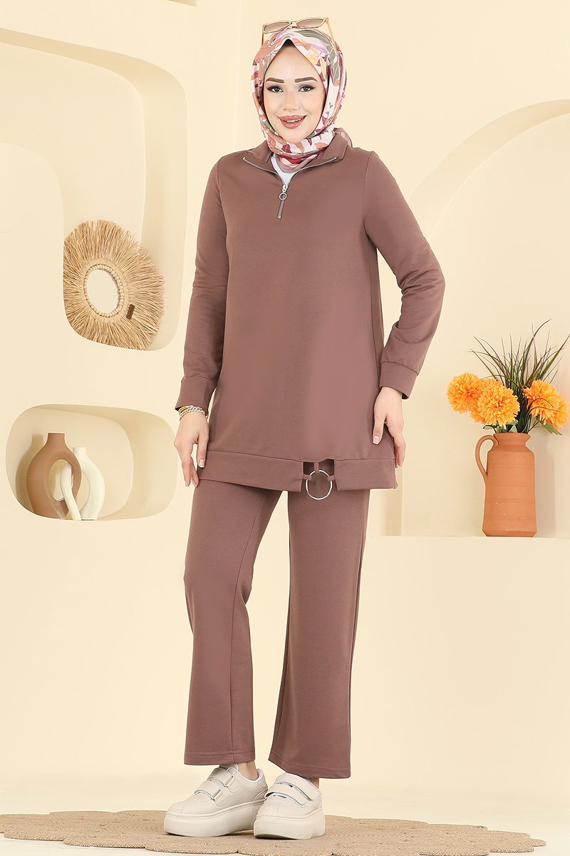 Yarım Fermuarlı Spor Takım model tesettür ürünüdür. Dört Mevsim sezonunda kullanılabilir. 30 derecede sıkma yapılmadan yıkanmalıdır. Birinci sınıf İki İplik kumaştan imal edilmiştir. Ürün Hakim yakadır. Astarsızdır. (Modelin üzerindeki ürün 38 bedendir.) Önden kullanılabilir yarım fermuarı bulunmaktadır. Metal aksesuar ürüne dikilidir. Pantolon beli lastiklidir.