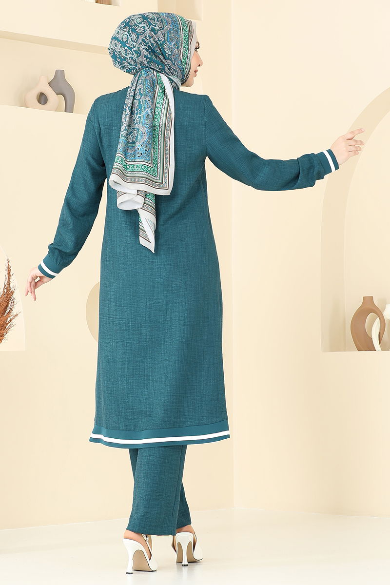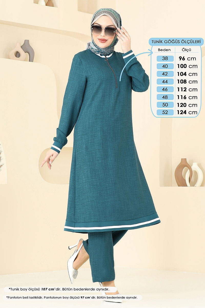 The Half-Zip Linen Suit is a distinguished hijab fashion piece designed for all-season wear. Made from delicate Sofia linen fabric, it offers a comfortable fit. This garment is machine washable at 30 degrees on a gentle cycle, ensuring its durability. Featuring a crew neck and unlined design, it provides a contemporary look while the elastic waist on the pants ensures a fit for all sizes. Comprising a tunic and pants, this set is perfect for those seeking both elegance and comfort in their attire.