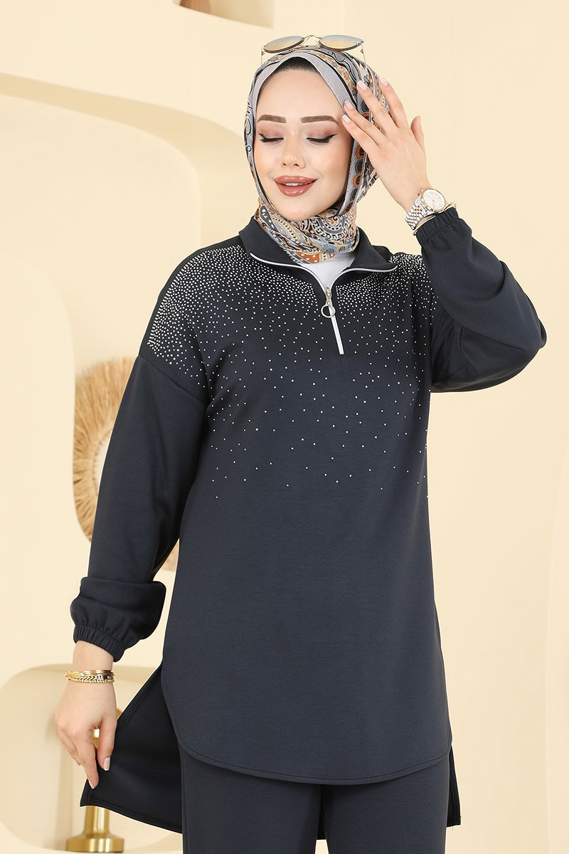 Product Feature : It is a new season hijab fashion product. There is a half zipper that can be used from the front. The product has a Upright collar. Unlined. The stones are glued. The waist of the trousers is elastic. The cuff is rubberized. There may be a tonal difference in the product due to concept photo shoots.