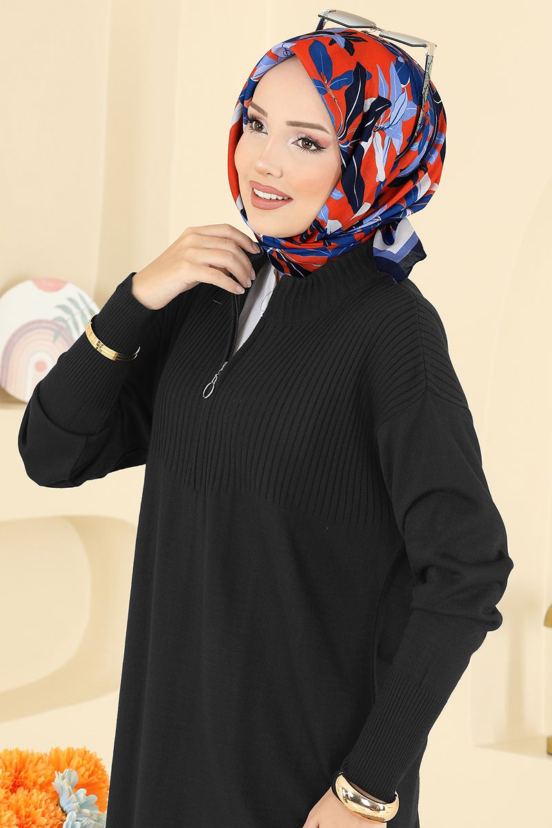 Yarım Fermuarlı Triko Elbise Siyah