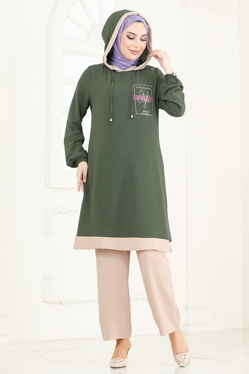 Ürün Özelliği : Yeni sezon tesettür moda ürünüdür. Ürün Kapşonlu yakadır. Tunik yandan yırtmaçlıdır.. Astarsızdır. Kapşon ürüne dikilidir. Yazılar baskıdır. Pantolon beli lastiklidir. Manşet lastiklidir. Konsept fotoğraf çekimlerinden dolayı üründe ton farklılığı olabilir.