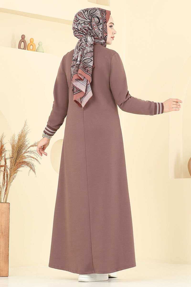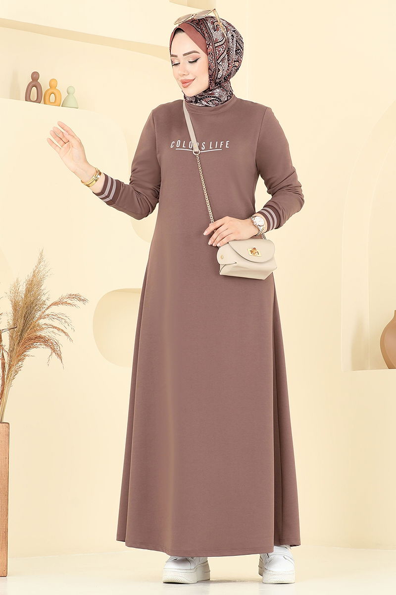 Yazı Baskılı Tesettür Elbise Pudra Vizyon