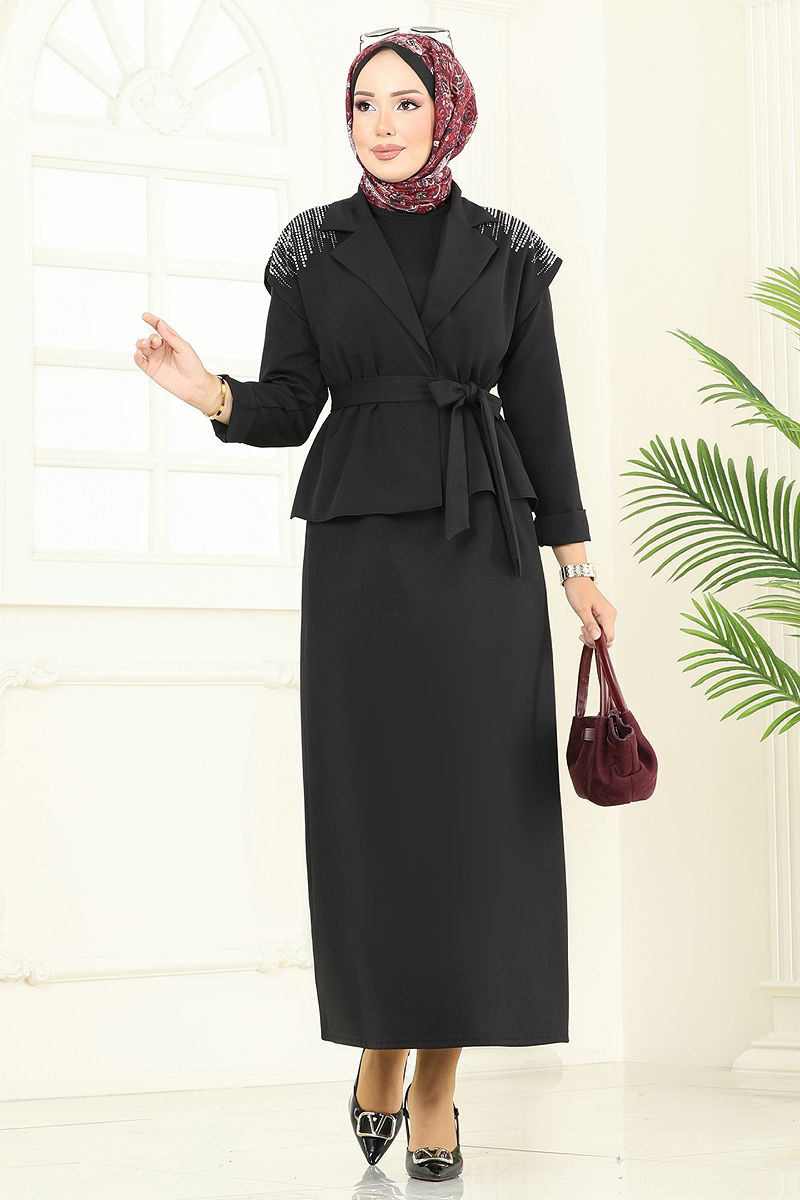 Yeleği Taşlı Elbiseli Takım KOMBİN; dört mevsim rahatlıkla kullanabileceğiniz, tesettür için uygun bir modeldir. 30 derecede hassas yıkama ile temizleyebileceğiniz bu ürün, dayanıklı Dabıl kumaştan üretilmiştir. Bisiklet yaka tasarıma sahip olan bu elbise astarsızdır ve 38 beden olarak model üzerinde sergilenmiştir. Sırt kısmında kullanışlı bir düğme bulunmakta, taş detayları ise yapıştırma yöntemiyle sabitlenmiştir. Kemer, dalgalanmayı önlemek için her iki ucu dikilmiş olup, orta kısmı dikişsizdir; kemer ürüne dahil, fakat isteğe bağlı olarak çıkarılabilir. Şık ve fonksiyonel bu takım ile şıklığınızı tamamlayın.